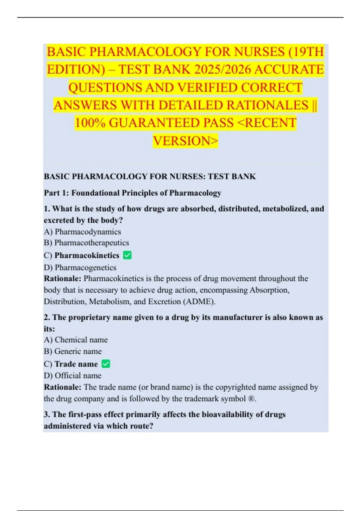 BASIC PHARMACOLOGY FOR NURSES (19TH EDITION) – TEST BANK 2025/2026 ACCURATE QUESTIONS AND VERIFIED CORRECT ANSWERS WITH DETAILED RATIONALES || 100% GUARANTEED PASS <RECENT VERSION>