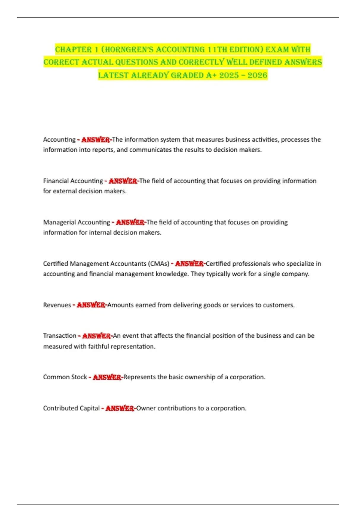 CHAPTER 1 (HORNGREN’S ACCOUNTING 11TH EDITION) EXAM WITH