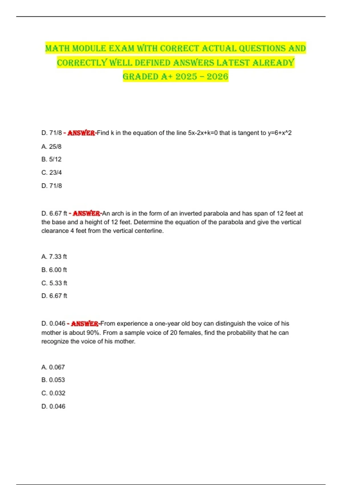 MATH MODULE EXAM WITH CORRECT ACTUAL QUESTIONS AND CORRECTLY WELL DEFINED ANSWERS LATEST ALREADY GRADED A+ 2025 – 2026