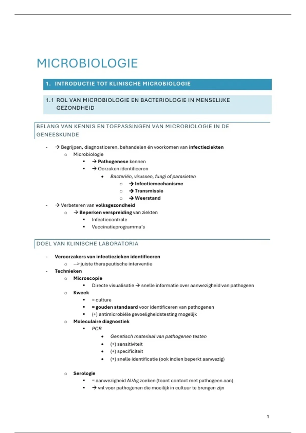 3e bachelorvak in uitdovend traject bachelor geneeskunde 2e bachelorvak in nieuw traject (vanaf 2023) Samenvatting omvat zelf geschreven notities, notities van professor onder de slides, de slides. Hoofdstukken: - Introductie tot klinische microbiologie - Bacteriologie - Diagnosticeren van bacteriële infecties - Vatbaarheid voor medicatie en therapeutic drug monitoring - Antibiotica en AMR - (Bacteriële) vaccinaties - Huid en weke delen infecties - Infecties van mond, oor en bovenste luchtwege - Urineweginfecties en SOA's - Gastro-intestinale infecties - Bot en weke delen infecties - Ernstige bacteriële infecties