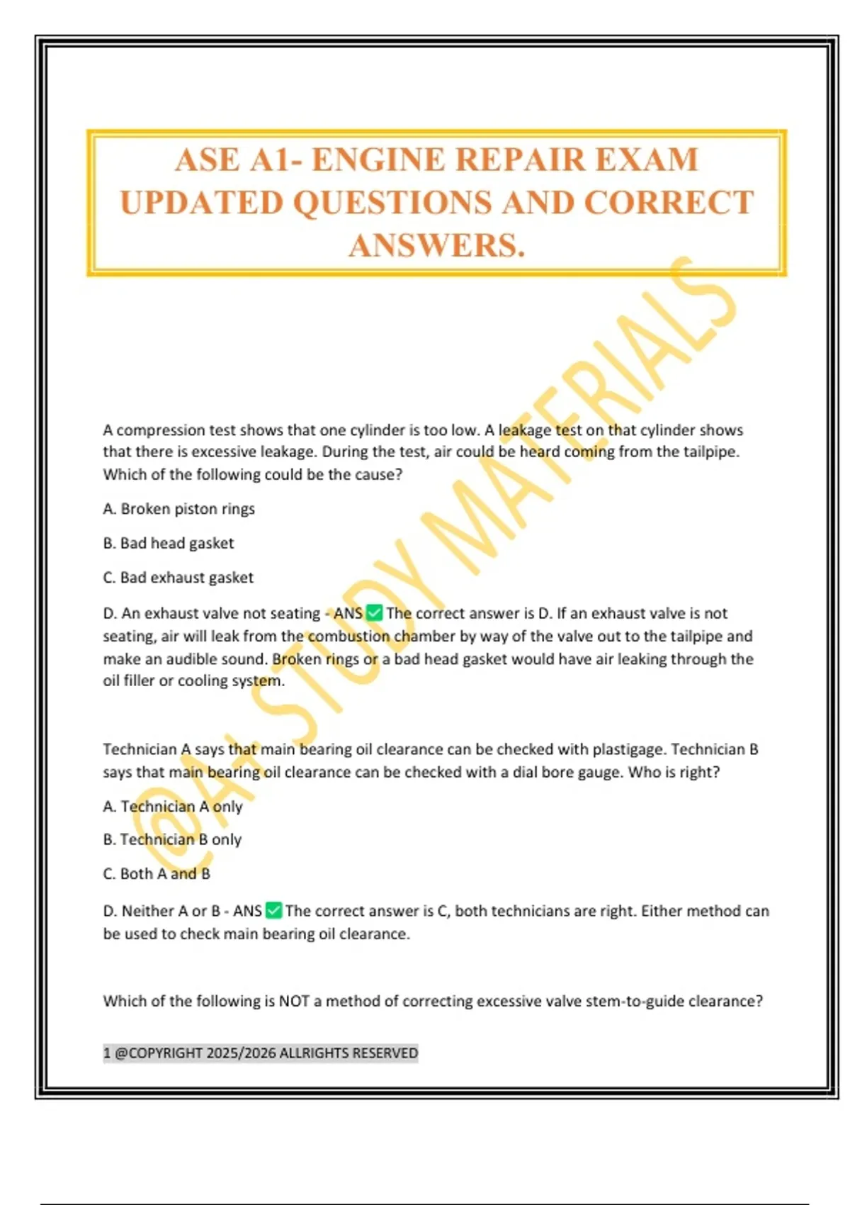 ASE A1- ENGINE REPAIR EXAM UPDATED QUESTIONS AND CORRECT ANSWERS.