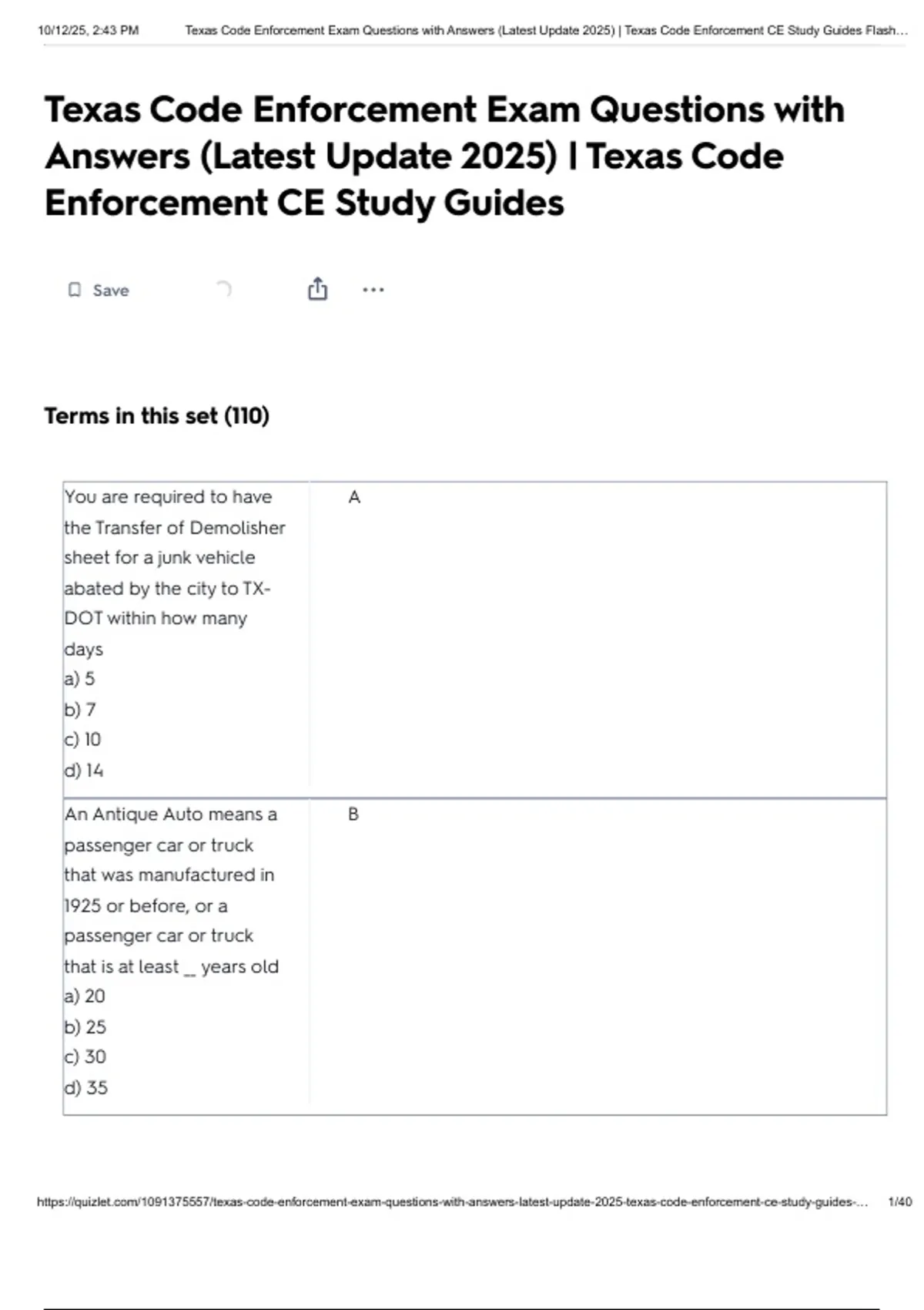 , 10/12/25, 2:43 PM Texas Code Enforcement Exam Questions with Answers (Latest Update 2025) | Texas Code Enforcement CE Study Guides Flash…