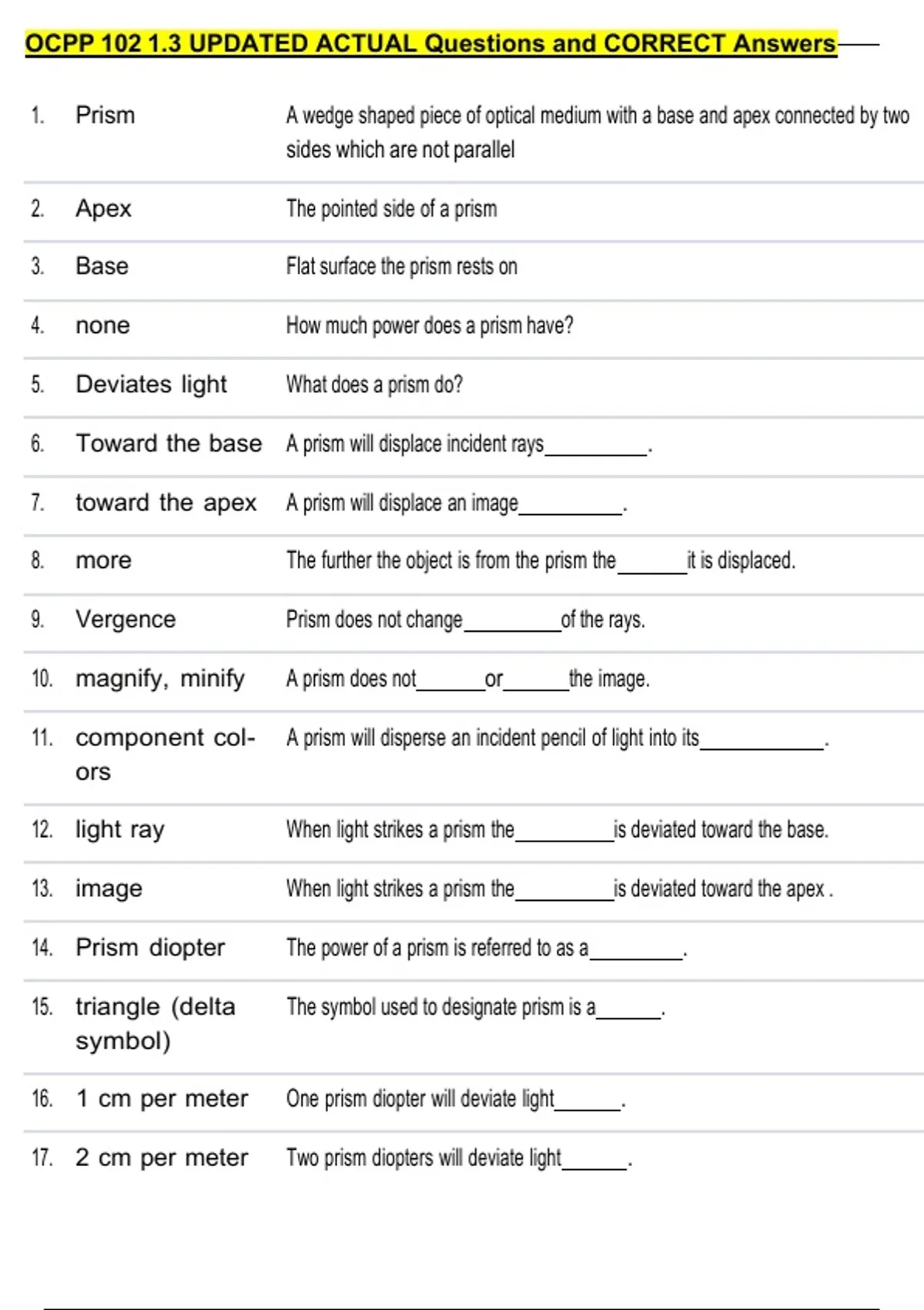 1. Prism A wedge shaped piece of optical medium with a base and apex connected by two