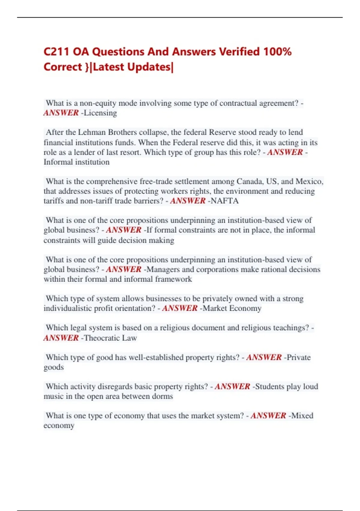 C211 OA Questions And Answers Verified 100% Correct }|Latest Updates| What is a non-equity mode involving some type of contractual agreement? - ANSWER -Licensing After the Lehman Brothers collapse, the federal Reserve stood ready to lend financial institutions funds. When the Federal reserve did this, it was acting in its role as a lender of last resort. Which type of group has this role? - ANSWER Informal institution What is the comprehensive free-trade settlement among Canada, US, and Mexico, that addresses issues of protecting workers rights, the environment and reducing tariffs and non-tariff trade barriers? - ANSWER -NAFTA What is one of the core propositions underpinning an institution-based view of global business? - ANSWER -If formal constraints are not in place, the informal constraints will guide decision making What is one of the core propositions underpinning an institution-based view of global business? - ANSWER -Managers and corporations make rational decisions within their formal and informal framework Which type of system allows businesses to be privately owned with a strong individualistic profit orientation? - ANSWER -Market Economy Which legal system is based on a religious document and religious teachings? - ANSWER -Theocratic Law Which type of good has well-established property rights? - ANSWER -Private goods Which activity disregards basic property rights? - ANSWER -Students play loud music in the open area between dorms What is one type of economy that uses the market system? - ANSWER -Mixed economy Which kind of outcome was Adam Smith referring to when describing the invisible hand? - ANSWER -Market outcomes What does the value of the marginal product of labor for a perfectly competitive, profit-maximizing firm equal? - ANSWER -Rate What is the change in total cost equal to? - ANSWER -Marginal cost multiplied by change in quantity Which condition must be satisfied for a competitive firm to shut down in a short run - ANSWER -Total variable costs are greater than total revenue What will a competitive firm do in the short run if its average variable cost exceeds price? - ANSWER -It will shut down What is a characteristic of a monopoly's demand curve? - ANSWER -It is the same as the market demand curve - downward sloping Which statement describes a monopoly demand curve? - ANSWER -It is less elastic than a perfectly competitive firms demand curve What is the profit maximization condition for a monopoly? - ANSWER -Where marginal revenue equals marginal cost What is a characteristic of monopolistic competition? - ANSWER -Many firms sell differentiated products How does self-interest influence each prisoner's decision in the prisoner's dilemma? - ANSWER -Both prisoners will likely confess Why is studying the prisoner's dilemma applicable to business? - ANSWER -It demonstrates the value of mapping out a potential strategy given actions of rivals What does an indifference curve illustrate? - ANSWER -The preferences of a consumer What happens to an individual's budget constraint if the budget decreases and prices remain the same? - ANSWER -The budget constraints line shifts parallel inward What happens to the nominal interest rate and the quantity of money if the Federal Reserve increases the reserve requirement? Choose 2 ANSWERs - ANSWER -The interest rate increases The quantity of money decreases What will happen to the equilibrium in the market for a good if demand and supply increase simultaneously? - ANSWER -Equilibrium quantity will always increase What concept measures how much the quantity supplied responds to change in price? - ANSWER -Price elasticity of supply Which elasticity of demand measures how the quantity demanded of one good responds to a change in price of another good? - ANSWER -Cross-price elasticity of demand What is the interest rate on a loan borrowed by banks from the federal reserves? - ANSWER -Discount rate Which target rate would the federal reserve lower in order to stimulate the economy and avoid a recession - ANSWER -The federal funds rate Which action would the federal reserve rate take to expand the money supply and lower the equilibrium interest rate? - ANSWER -Purchase government bonds on the open market What happens when the price of a good increases holding everything else constant? - ANSWER -Consumer surplus decreases Which activity will result in an increase in gross domestic product (GDP) other things being equal? - ANSWER -A law passes making the sale of recreational marijuana legal Which two types of investment are included in gross domestic product (GDP) 2 ANSWERs - ANSWER -Spending to build new factories Spending on consumer durable goods A nation begins applying a tariff on bananas which is imported product -