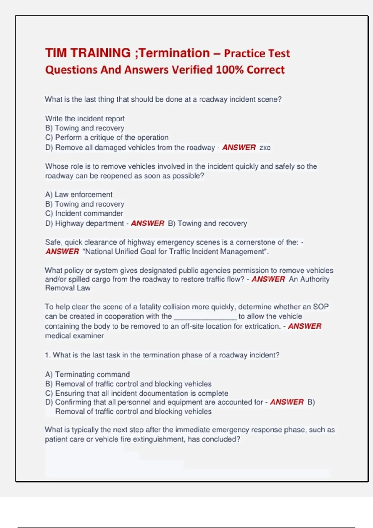 TIM TRAINING ;Termination – Practice Test Questions And Answers Verified 100% Correct What is the last thing that should be done at a roadway incident scene? Write the incident report B) Towing and recovery C) Perform a critique of the operation D) Remove all damaged vehicles from the roadway - ANSWER zxc Whose role is to remove vehicles involved in the incident quickly and safely so the roadway can be reopened as soon as possible? A) Law enforcement B) Towing and recovery C) Incident commander D) Highway department - ANSWER B) Towing and recovery Safe, quick clearance of highway emergency scenes is a cornerstone of the: - ANSWER "National Unified Goal for Traffic Incident Management". What policy or system gives designated public agencies permission to remove vehicles and/or spilled cargo from the roadway to restore traffic flow? - ANSWER An Authority Removal Law To help clear the scene of a fatality collision more quickly, determine whether an SOP can be created in cooperation with the _______________ to allow the vehicle containing the body to be removed to an off-site location for extrication. - ANSWER medical examiner 1. What is the last task in the termination phase of a roadway incident? A) Terminating command B) Removal of traffic control and blocking vehicles C) Ensuring that all incident documentation is complete D) Confirming that all personnel and equipment are accounted for - ANSWER B) Removal of traffic control and blocking vehicles What is typically the next step after the immediate emergency response phase, such as patient care or vehicle fire extinguishment, has concluded? A) Terminate command B) Create a termination plan C) Stow fire, rescue, and EMS equipment D) Perform a personnel accountability check - ANSWER B) Create a termination plan Which one of the following is not part of the roadway incident termination plan? A) Removal of detours B) Repair of the roadway C) Incident documentation D) Notification of the Traffic Management Center - ANSWER C) Incident documentation ***NOT SURE+++ Once all tasks are complete and you are ready to reopen the road or lane, you may dismantle the scene. What is the correct manner in which to accomplish this task? A) From the Advance Warning Area forward to the Activity Area B) From the Termination Area backward to the Activity Area C) From the Termination Area forward to the Advance Warning Area D) From the Termination Area backward to the Advance Warning Area - ANSWER D) From the Termination Area backward to the Advance Warning Area Deploy emergency vehicles __________ as advance warning and blocking when temporary traffic control devices are being removed and/or when equipment is being demobilized. A) special B) parallel C) upstream D) downstream - ANSWER C) upstream What is the first key to smooth roadway operations involving towing and recovery?
