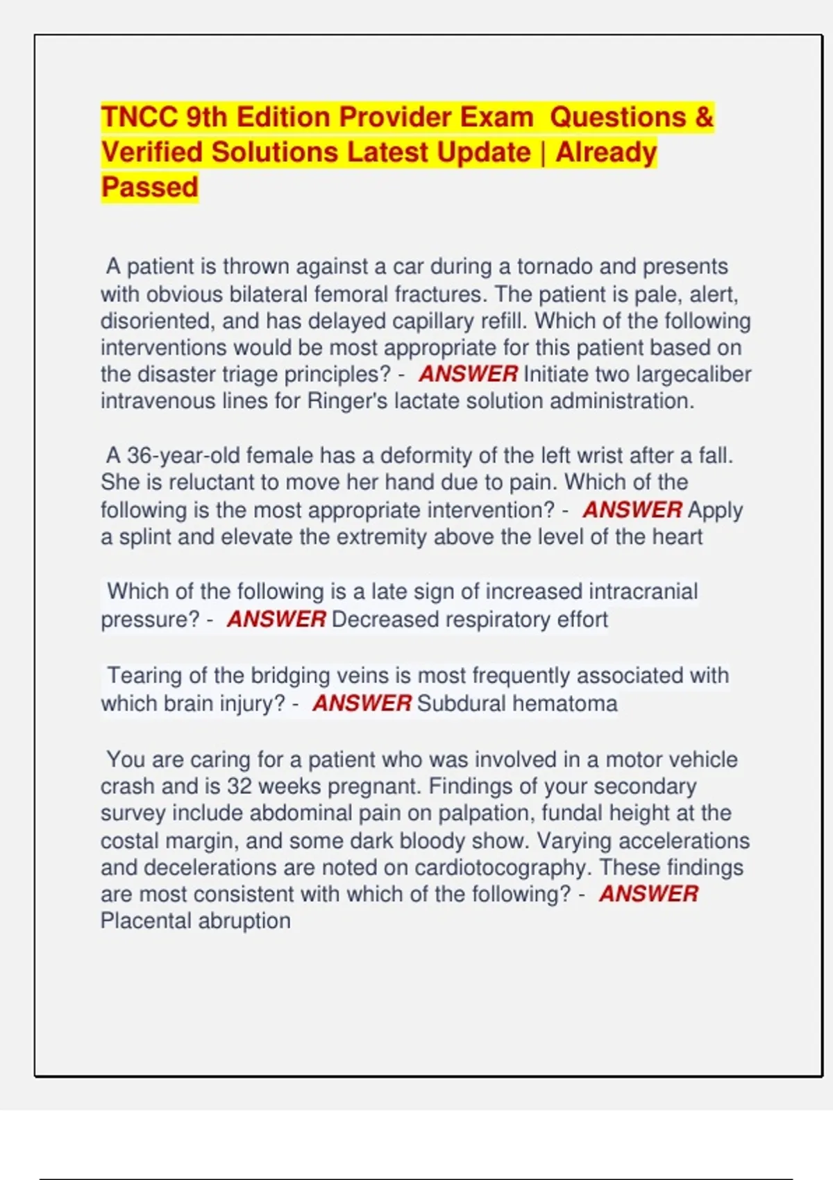 TNCC 9th Edition Provider Exam Questions & Verified Solutions Latest Update | Already Passed