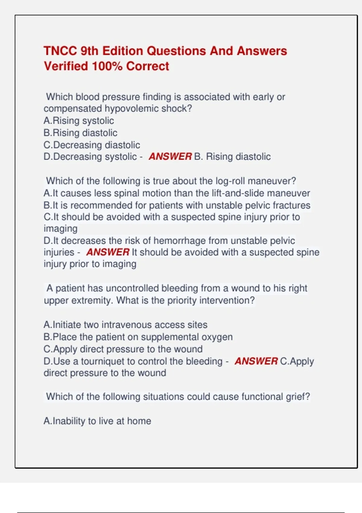 TNCC 9th Edition Questions And Answers Verified 100% Correct Which blood pressure finding is associated with early or compensated hypovolemic shock? A.Rising systolic B.Rising diastolic C.Decreasing diastolic D.Decreasing systolic - ANSWER B. Rising diastolic Which of the following is true about the log-roll maneuver? A.It causes less spinal motion than the lift-and-slide maneuver B.It is recommended for patients with unstable pelvic fractures C.It should be avoided with a suspected spine injury prior to imaging D.It decreases the risk of hemorrhage from unstable pelvic injuries - ANSWER It should be avoided with a suspected spine injury prior to imaging A patient has uncontrolled bleeding from a wound to his right upper extremity. What is the priority intervention? A.Initiate two intravenous access sites B.Place the patient on supplemental oxygen C.Apply direct pressure to the wound D.Use a tourniquet to control the bleeding - ANSWER C.Apply direct pressure to the wound Which of the following situations could cause functional grief? A.Inability to live at home B.Amputation of a limb C.Loss of one's self-image D.Destruction of the patient's car - ANSWER B.Amputation of a limb Using the American College of Surgeons screening guidelines, what assessment finding would prompt the nurse to prepare a patient for cervical spine imaging? A.Alert with no neurologic deficits B.Multiple abrasions to the extremities C.Ecchymosis to the flank D.Responds to verbal stimulation - ANSWER A.Alert with no neurologic deficits An adult was thrown against a concrete wall during a factory explosion and sustained a femur fracture, liver laceration, and a small subdural hematoma. These injuries most likely occurred during what level of blast trauma? A.Primary B.Secondar y C.Tertiary D.Quaternary - ANSWER C.Tertiary An adult patient was brought to the emergency department following a motorcycle crash. On arrival, the patient is only responsive to pain, has bleeding from the nose, and multiple abrasions and contusions to the face. What is the priority intervention? A.Use a bulb syringe to suction out secretions from the mouth. B.Insert a nasopharyngeal airway to maintain an open airway. C.Use a jaw thrust to open the airway and look for signs of obstruction. D.Ask the patient to open their mouth to inspect the airway. - ANSWER C.Use a jaw thrust to open the airway and look for signs of obstruction. An adult pedestrian was struck on the right side by a sport utility vehicle traveling at 40 mph. The patient is awake and alert and the right leg is shortened. Following initial resuscitation with fluids, the patient remains hypotensive. What would be the priority intervention? A.Send blood for type and crossmatch B.Apply a pelvic binder C.Prepare the patient for surgery D.Insert a urinary catheter - ANSWER Apply a pelvic binder A severely injured patient has been intubated and is being mechanically ventilated. The patient has received a balanced resuscitation including multiple blood products. Under which circumstance will it be harder for the hemoglobin to release oxygen to the tissues? A.Decreased pH B.Elevated carbon dioxide level C.Decreased body temperature D.Increased metabolic demand - ANSWER C.Decreased body temperature