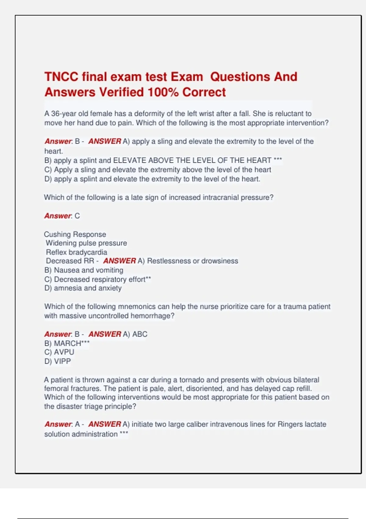 TNCC final exam test Exam Questions And Answers Verified 100% Correct A 36-year old female has a deformity of the left wrist after a fall. She is reluctant to move her hand due to pain. Which of the following is the most appropriate intervention? Answer: B - ANSWER A) apply a sling and elevate the extremity to the level of the heart. B) apply a splint and ELEVATE ABOVE THE LEVEL OF THE HEART *** C) Apply a sling and elevate the extremity above the level of the heart D) apply a splint and elevate the extremity to the level of the heart. Which of the following is a late sign of increased intracranial pressure? Answer: C Cushing Response Widening pulse pressure Reflex bradycardia Decreased RR - ANSWER A) Restlessness or drowsiness B) Nausea and vomiting C) Decreased respiratory effort** D) amnesia and anxiety Which of the following mnemonics can help the nurse prioritize care for a trauma patient with massive uncontrolled hemorrhage? Answer: B - ANSWER A) ABC B) MARCH*** C) AVPU D) VIPP A patient is thrown against a car during a tornado and presents with obvious bilateral femoral fractures. The patient is pale, alert, disoriented, and has delayed cap refill. Which of the following interventions would be most appropriate for this patient based on the disaster triage principle? Answer: A - ANSWER A) initiate two large caliber intravenous lines for Ringers lactate solution administration *** B) Administer Dilaudid for pain control and provide comfort care C) Place the patient in an observation area for care within the next few hours D) Contact the command center for the personnel to notify next of kin. A patient arrives with a large open chest wound after being assault ed with a machete, Prehospital providers placed a nonporous dressing over the chest wound and tapes it on 3 sides. He is now showing signs of anxiety, restlessness, severe respiratory distress, cyanosis, and decreasing blood pressure. Which of the following is the MOST appropriate interventions? Answer: C - ANSWER A) needle decompression B) tube thoracostomy C) dressing removal ** D) surgical repair A patient is found lying on the floor after falling 13 hours ago. Which of the following lab values is expected with a musculoskeletal complication associated with this presentation? Answer: A - ANSWER A) elevated creatine kinase *** B) decreased potassium level C) decreased WBC D) elevated GFR A 56-year- male patient involved in a MVC is brought to the ED of a rural critical access facility. He c/o neck pain, SOB, and diffuse abd pain. His GCS is 15. His vitals are as follows: BP 98/71 HR 125 beats/min RR 26 breaths/min SpO2 94% on high flow O2 via NRB mask which of the following is the priority intervention for this patient? Answer: C - ANSWER A) Expedite transport to the CT scanner B) prepare the patient for spinal radiographs C) expedite transfer to the closest trauma center *** D) notify the patients family Caregivers carry a 2-year old into the ED who fell out of 2nd story window. The patient is awake and crying with increased work of breathing and pale skin. which of the following interventions has the highest priority? Answer: A - ANSWER A) padding the upper back while stabilizing the cervical spine *** B) applying a tight-fitting NRB mask with an attached resevior C) establishing intravenous access and administering a 20mL/kg bolus D) preparing for drug assisted intubation Which of the following is a component of the trauma triad of death? Answer: A hypothermia, metabolic acidosis, coagulopathy - ANSWER A) Acidosis ** B) hyperthermia C) hemorrhage D) sepsis A 35-year old male presents with facial trauma after bring struck inthe face with a baseball. a tear-drop shaped left pupil is noted on exam. What type of injury is suspected? Answer: B - ANSWER A) oculomotor nerve palsy B) globe rupture *** C) uncal herniation D) retinal detachment Which of the following is true about the log roll maneuver? Answer: C - ANSWER A) it causes less spinal motion than the lift and slide manuever B) it is recommended for patients with unstable pelvic fractures C) it can worsen cord damage from an unstable spinal injury *** D) it does not increases the risk of life threatening hemorrhage from unstable injuries EMS arrives with the intoxicated driver of a car involved in a MVC. EMS reports significant damage to the drivers side of the car. The patient is asking to have the cervical color removed. when is it appropriate to remove the cervical collar? Answer: A - ANSWER A) after a physical examination if the patient has no radiologic abnormalities on a computed tomography scan *** B) after physician evaluation if the patient has not neurologic abnormalities on exam C) after palpation of the spine if the patient has no point tenderness the the vertebral column D) after physical examination if the patient has not neck pain with movement Tearing of the bridging veins is most frequently associated with which brain injury?