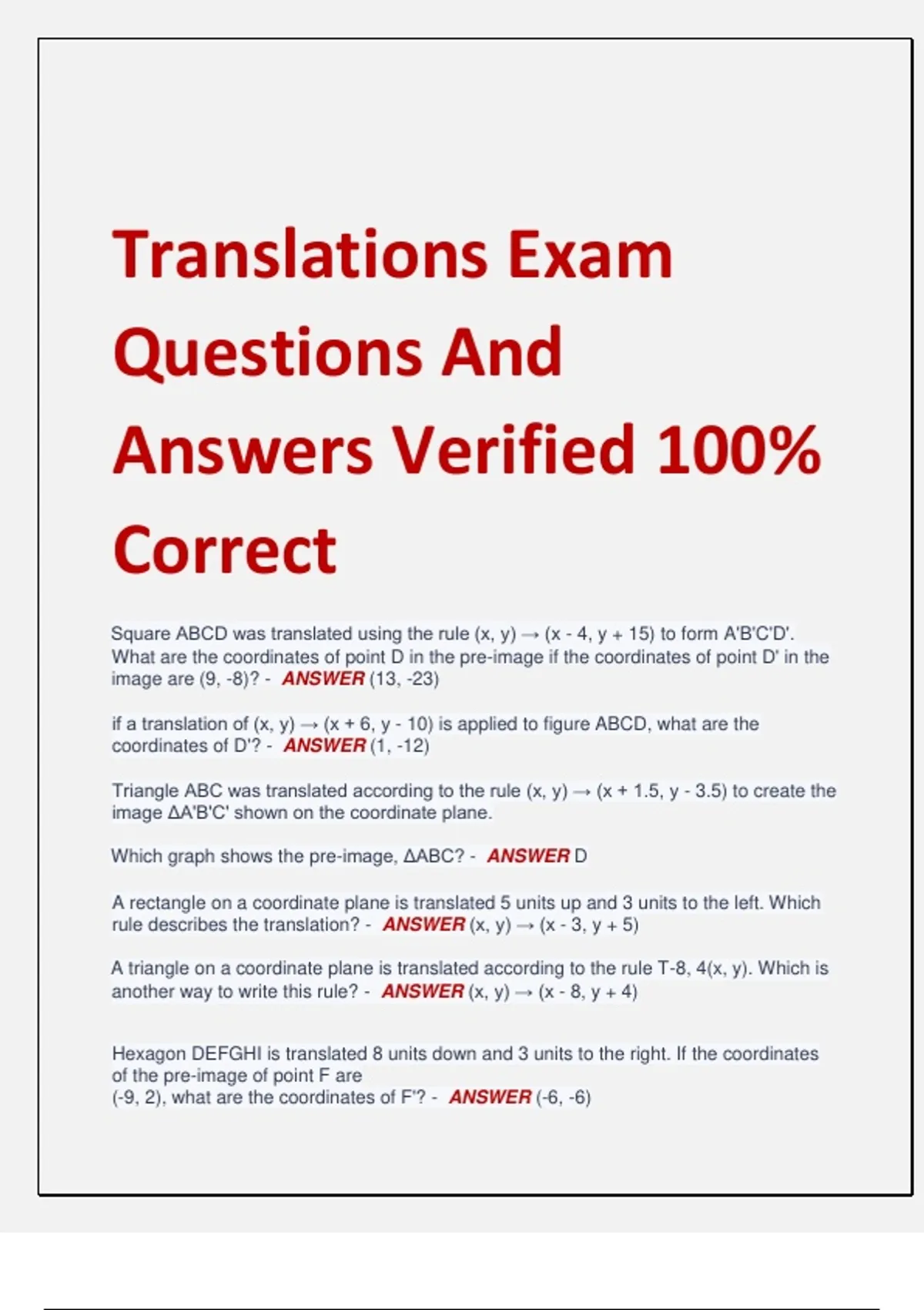rule describes the translation? - ANSWER (x, y) → (x - 3, y + 5)