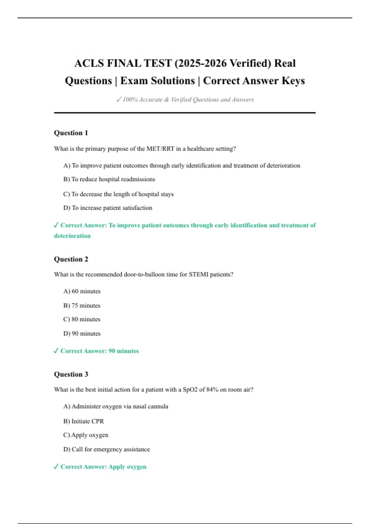 ACLS FINAL TEST Verified Quizzes with Solutions and Verification Keys
