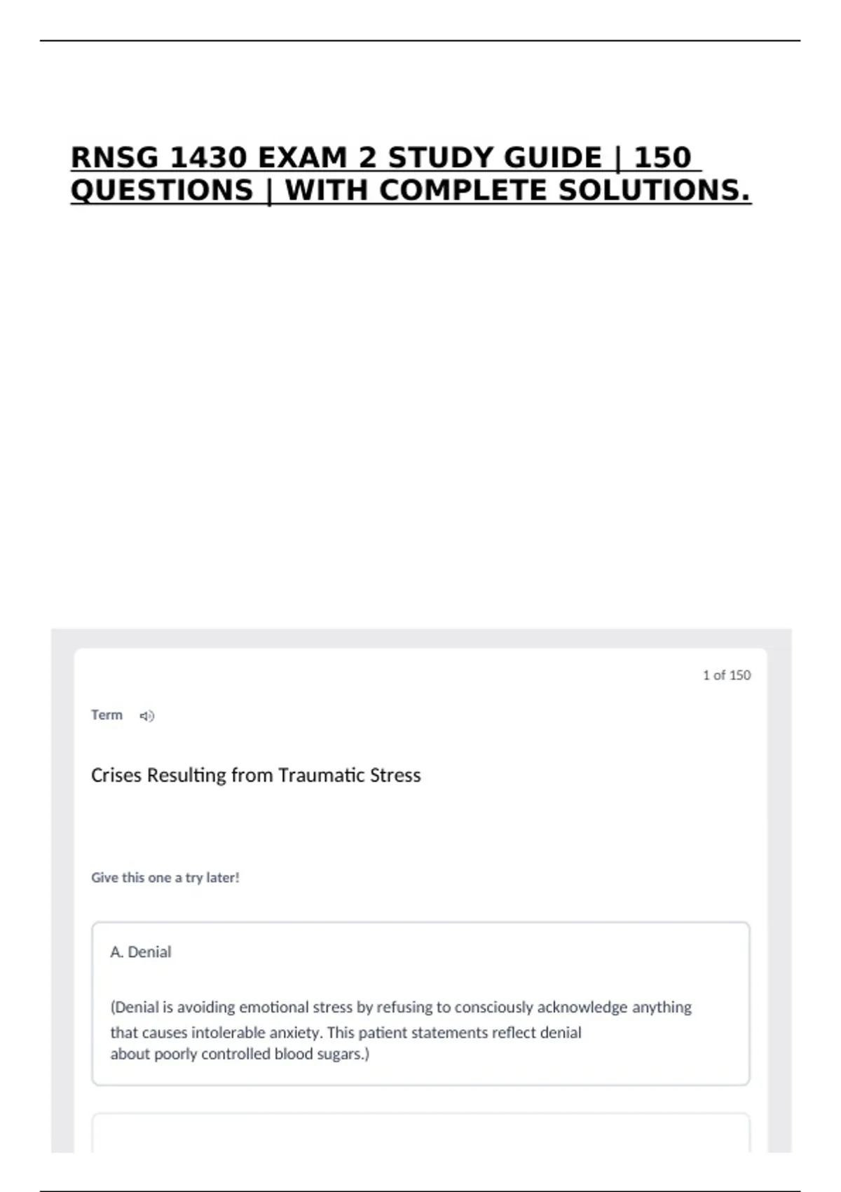 RNSG 1430 EXAM 2 STUDY GUIDE | 150 QUESTIONS | WITH COMPLETE SOLUTIONS.