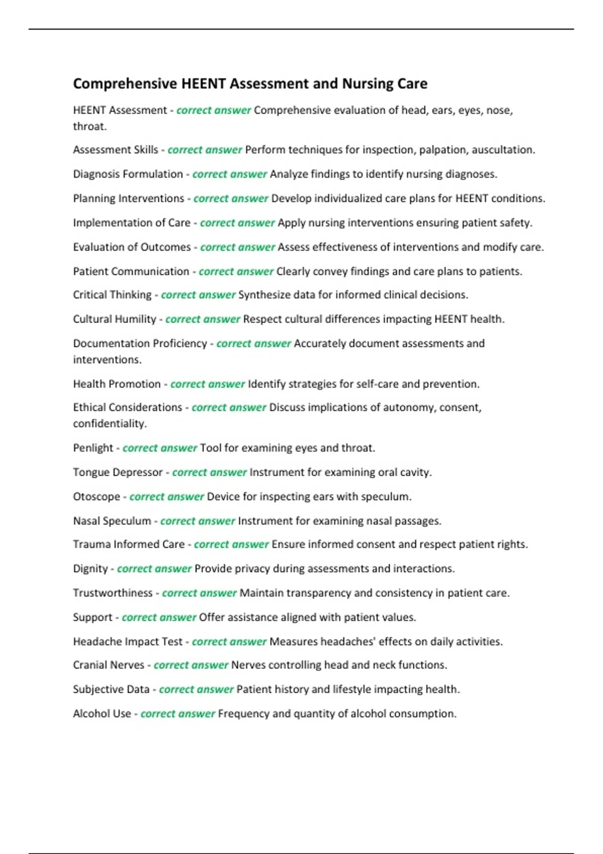 HEENT Assessment - correct answer Comprehensive evaluation of head, ears, eyes, nose, throat. Assessment Skills - correct answer Perform techniques for inspection, palpation, auscultation. Diagnosis Formulation - correct answer Analyze findings to identify nursing diagnoses. Planning Interventions - correct answer Develop individualized care plans for HEENT conditions. Implementation of Care - correct answer Apply nursing interventions ensuring patient safety. Evaluation of Outcomes - correct answer Assess effectiveness of interventions and modify care. Patient Communication - correct answer Clearly convey findings and care plans to patients. Critical Thinking - correct answer Synthesize data for informed clinical decisions. Cultural Humility - correct answer