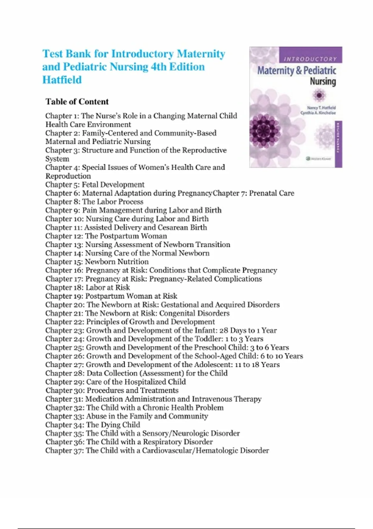 Test Bank for Introductory Maternity and Pediatric Nursing 4th Edition Hatfield Test Bank. Table of contents; Chapter 1: The Nurse's Role in a Changing Maternal–Child Health Care Environment Chapter 2: Family-Centered and Community-Based Maternal and Pediatric Nursing Chapter 3: Structure and Function of the Reproductive System Chapter 4: Special Issues of Women's Health Care and Reproduction Chapter 5: Fetal Development Chapter 6: Maternal Adaptation during Pregnancy Chapter 7: Prenatal Care Chapter 8: The Labor Process Chapter 9: Pain Management during Labor and Birth Chapter 10: Nursing Care during Labor and Birth Chapter 11: Assisted Delivery and Cesarean Birth Chapter 12: The Postpartum Woman Chapter 13: Nursing Assessment of Newborn Transition Chapter 14: Nursing Care of the Normal Newborn Chapter 15: Newborn Nutrition Chapter 16: Pregnancy at Risk: Conditions that Complicate Pregnancy Chapter 17: Pregnancy at Risk: Pregnancy-Related Complications Chapter 18: Labor at Risk Chapter 19: Postpartum Woman at Risk Chapter 20: The Newborn at Risk: Gestational and Acquired Disorders Chapter 21: The Newborn at Risk: Congenital Disorders Chapter 22: Principles of Growth and Development Chapter 23:Growth and Development of the Infant: 28 Days to 1 Year Chapter 24:Growth and Development of the Toddler: 1 to 3 Years Chapter 25:Growth and Development of the Preschool Child: 3 to 6 Years Chapter 26:Growth and Development of the School-Aged Child: 6 to 10 Years Chapter 27:Growth and Development of the Adolescent: 11 to 18 Years UNIT VIII: FOUNDATIONS OF PEDIATRIC NURSING Chapter 28: Data Collection (Assessment) for the Child Chapter 29: Care of the Hospitalized Child Chapter 30: Procedures and Treatments Chapter 31: Medication Administration and Intravenous Therapy UNIT IX: SPECIAL CONCERNS OF PEDIATRIC NURSING Chapter 32: The Child with a Chronic Health Problem Chapter 33: Abuse in the Family and Community Chapter 34: The Dying Child UNIT X: THE CHILD WITH A HEALTH DISORDER Chapter 35: The Child with a Sensory/Neurologic Disorder Chapter 36: The Child with a Respiratory Disorder Chapter 37: The Child with a Cardiovascular/Hematologic Disorder Chapter 38: The Child with a Gastrointestinal/Endocrine Disorder Chapter 39: The Child with a Genitourinary Disorder Chapter 40: The Child with a Musculoskeletal Disorder Chapter 41: The Child with an Integumentary Disorder/Communicable Disease Chapter 42: The Child with a Psychosocial Disorder Chapter 1: The Nurse's Role in a Changing Maternal–Child Health Care Environment MULTIPLE CHOICE 1. Which principle of teaching should the nurse use to ensure learning in a family situation? a. Motivate the family with praise and positive feedback. b. Learning is best accomplished with the lecture format. c. Present complex subject material first while the family is alert and ready to learn. d. Families should be taught using medical jargon so they will be able to understand the technical language used by physicians. ANS: A Praise and positive feedback are particularly important when a family is trying to master a frustrating task such as breastfeeding. A lively discussion stimulates more learning than a straight lecture, which tends to inhibit questions. Learning is enhanced when the teaching is structured to present the simple tasks before the complex material. Even though a family may understand English fairly well, they may not understand the medical terminology or slang terms that are used. PTS: 1 DIF: Cognitive Level: Application REF: 18, 19 OBJ: Nursing Process Step: Planning MSC: Client Needs: Health Promotion and Maintenance 2. Which nursing intervention is an independent function of the nurse? a. Administering oral analgesics b. Requesting diagnostic studies c. Teaching the client perineal care d. Providing wound care to a surgical incision ANS: C Nurses are now responsible for various independent functions, including teaching, counseling, and intervening in nonmedical problems. Interventions initiated by the physician and carried out by the nurse are called dependent functions. Administrating oral analgesics is a dependent function; it is initiated by a physician and carried out by a nurse. Requesting diagnostic studies is a dependent function. Providing wound care is a dependent function; it is usually initiated by the physician through direct orders or protocol. PTS: 1 DIF: Cognitive Level: Understanding REF: 24 OBJ: Nursing Process Step: Assessment MSC: Client Needs: Safe and Effective Care Environment 3. Which most therapeutic response to the clients statement, Im afraid to have a cesarean birth should be made by the nurse? a. Everything will be OK. b. Dont worry about it. It will be over soon. c. What concerns you most about a cesarean birth? d. The physician will be in later and you can talk to him. ANS: C The response, What concerns you most about a cesarean birth focuses on what the client is saying and asks for clarification, which is the most therapeutic response. The response, Everything will be ok is belittling the clients feelings. The response, Dont worry about it. It will be over soon will indicate that the clients feelings are not important. The response, The physician will be in later and you can talk to him does not allow the client to verbalize her feelings when she wishes to do that. PTS: 1 DIF: Cognitive Level: Application REF: 18 OBJ: Nursing Process Step: Implementation MSC: Client Needs: Psychosocial Integrity 4. Which action should the nurse take to evaluate the clients learning about performing infant care? a. Demonstrate infant care procedures. b. Allow the client to verbalize the procedure. c. Routinely assess the infant for cleanliness. d. Observe the client as she performs the procedure. ANS: D The clients correct performance of the procedure under the nurses supervision is the best proof of her ability. Demonstration is an excellent teaching method, but not an evaluation method. During verbalization of the procedure, the 
