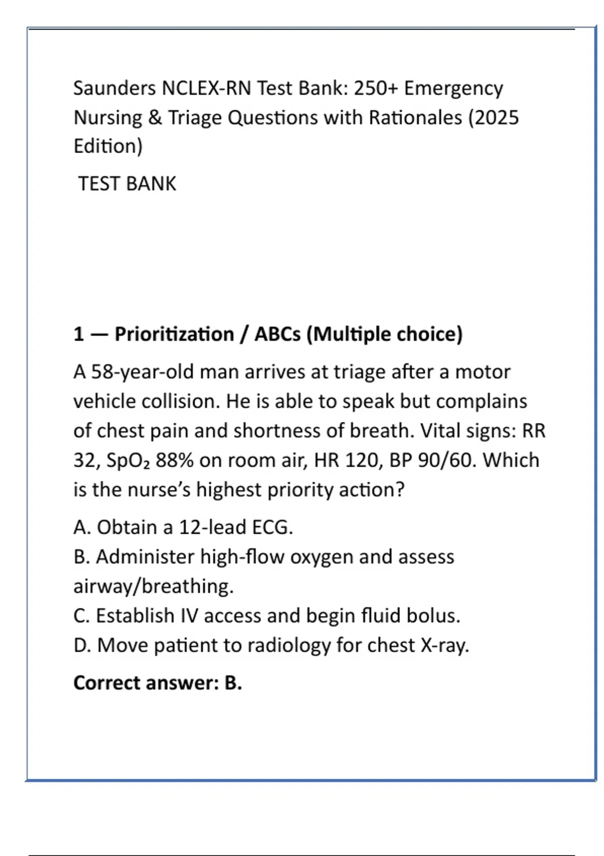 NCLEX-RN Test Bank: Saunders Review — 250+ NGN-Style Questions on Emergency Nursing and Triage for Exam Mastery Meta description (150–160 characters) 250+ NGN-style NCLEX-RN Test Bank questions from Saunders Review on Emergency Nursing and Triage — prioritize, triage, and master clinical judgment for NCLEX-2025. (Length: 153 characters) 10–12 Targeted SEO Keywords NCLEX-RN Test Bank Saunders Review Emergency Nursing and Triage NGN-style NCLEX questions NCLEX 2025 Test Plan prep Clinical Judgment Model practice Triage exam questions Nursing prioritization questions Shock, trauma, burns NCLEX items Anaphylaxis and cardiac arrest review Nurse educator test bank High-yield NCLEX practice 10 Hashtags for Social Sharing #NCLEXRN #SaundersReview #NursingStudents #EmergencyNursing #TriageTraining #NGNprep #NurseEducator #NCLEX2025 #ClinicalJudgment #TestBank Long-form Product Description (≈520 words)