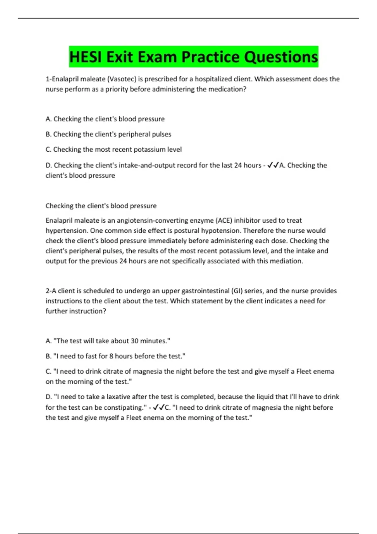 1-Enalapril maleate (Vasotec) is prescribed for a hospitalized client. Which assessment does the