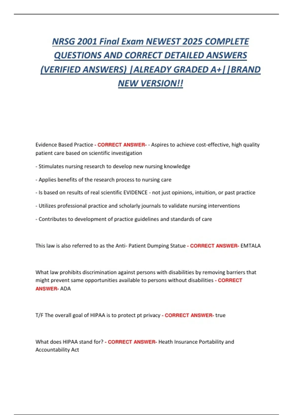 On this platform, you will discover a variety of meticulously crafted study materials, including detailed documents, comprehensive bundles, and expertly designed flashcards provided by the seller, Trustednurse. These resources are thoughtfully prepared to support your learning journey and make your studies and exam preparations smooth and effective. I am here to offer any assistance or answer any questions you may have regarding your academic needs. Please don’t hesitate to reach out for guidance or support—I am more than happy to help you achieve success in your courses and exams. Wishing you a seamless and rewarding learning experience. Thank you so much for choosing these resources!