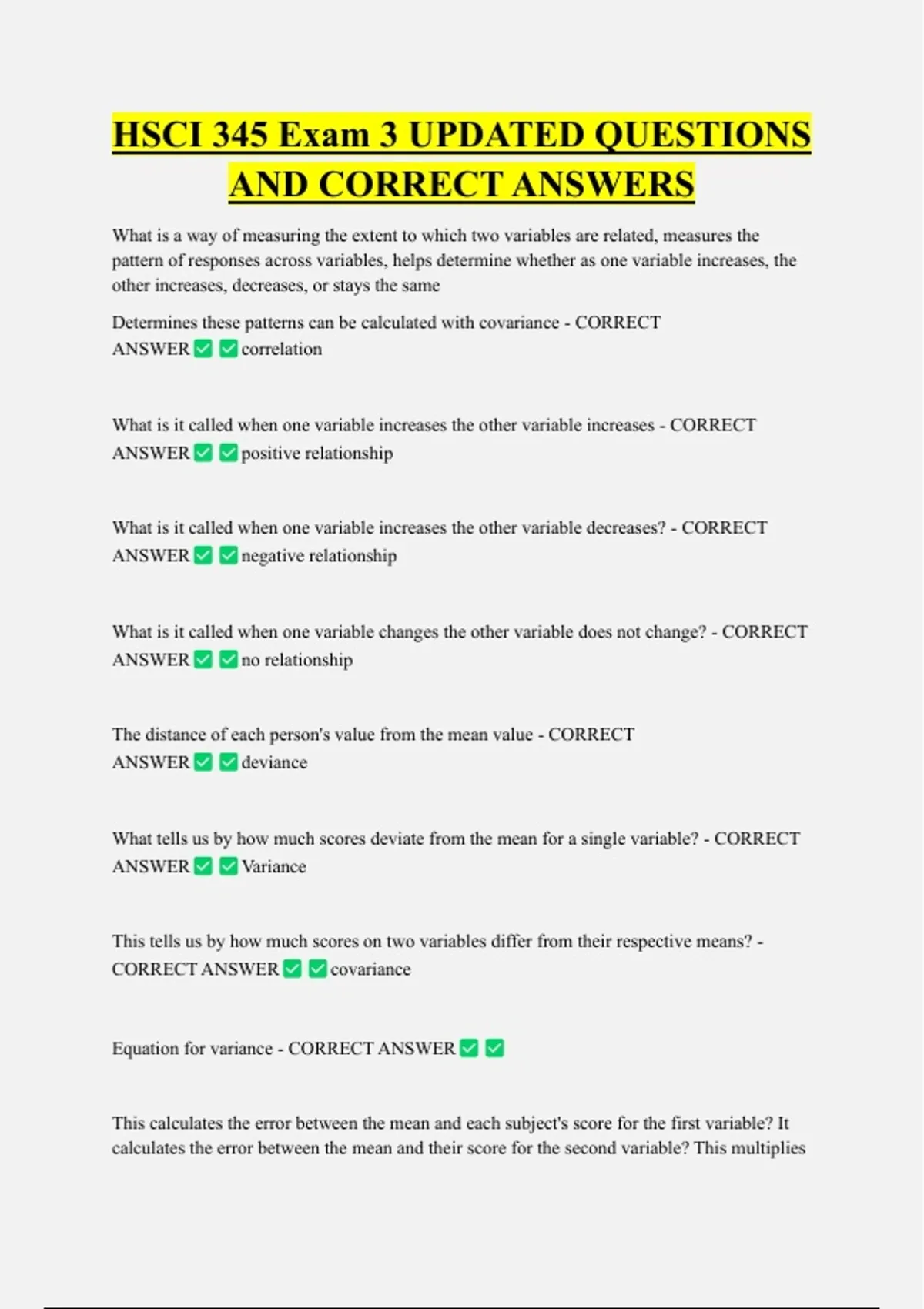 HSCI 345 Exam 3 UPDATED QUESTIONS AND CORRECT ANSWERS What is a way of measuring the extent to which two variables are related, measures the pattern of responses across variables, helps determine whether as one variable increases, the other increases, decreases, or stays the same Determines these patterns can be calculated with covariance - CORRECT ANSWER correlation What is it called when one variable increases the other variable increases - CORRECT ANSWER positive relationship What is it called when one variable increases the other variable decreases? - CORRECT ANSWER negative relationship What is it called when one variable changes the other variable does not change? - CORRECT ANSWER no relationship The distance of each person's value from the mean value - CORRECT ANSWER deviance What tells us by how much scores deviate from the mean for a single variable? - CORRECT ANSWER Variance