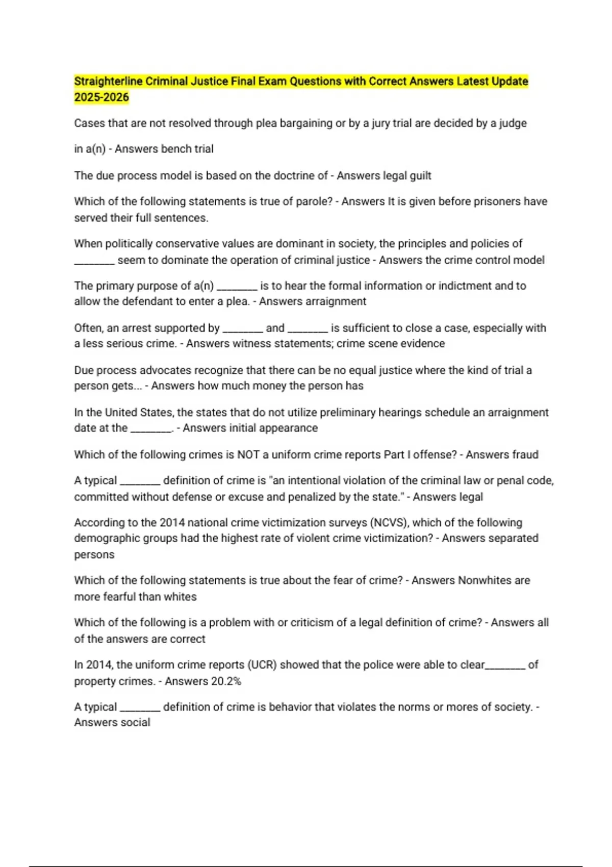 Straighterline Criminal Justice Final Exam Questions with Correct Answers Latest Update Cases that are not resolved through plea bargaining or by a jury trial are decided by a judge in a(n) - Answers bench trial The due process model is based on the doctrine of - Answers legal guilt Which of the following statements is true of parole? - Answers It is given before prisoners have served their full sentences. When politically conservative values are dominant in society, the principles and policies of ________ seem to dominate the operation of criminal justice - Answers the crime control model The primary purpose of a(n) ________ is to hear the formal information or indictment and to allow the defendant to enter a plea. - Answers arraignment Often, an arrest supported by ________ and ________ is sufficient to close a case, especially with a less serious crime. - Answers witness statements; crime scene evidence Due process advocates recognize that there can be no equal justice where the kind of trial a person gets... - Answers how much money the person has In the United States, the states that do not utilize preliminary hearings schedule an arraignment date at the ________. - Answers initial appearance Which of the following crimes is NOT a uniform crime reports Part I offense? - Answers fraud A typical ________ definition of crime is "an intentional violation of the criminal law or penal code, committed without defense or excuse and penalized by the state." - Answers legal According to the 2014 national crime victimization surveys (NCVS), which of the following demographic groups had the highest rate of violent crime victimization? - Answers separated persons Which of the following statements is true about the fear of crime? - Answers Nonwhites are more fearful than whites Which of the following is a problem with or criticism of a legal definition of crime? - Answers all of the answers are correct In 2014, the uniform crime reports (UCR) showed that the police were able to clear________ of property crimes. - Answers 20.2% A typical ________ definition of crime is behavior that violates the norms or mores of society. - Answers social Which of the following sets of characteristics best describes the typical arrestee in 2014? - Answers young, male and white For Émile Durkheim, the cause of crime is ________, that is, the dissociation of the individual from the ________. - Answers a. anomie; collective conscience Which of the following best captures classical criminologists' concept of "utility"? - Answers "the greatest happiness shared by the greatest number" According to body-type theory, an athletically built individual would be classified under the ________ body type. - Answers mesomorphic Which of the following is a product of the Enlightenment period, or the Age of Reason, a period of history that began in the early 1500s and lasted until the late 1700s? - Answers classical theory According to Robert K. Merton, ________ pursue the cultural goal of wealth only through legitimate institutional means. - Answers conformers Which of the following theories is based on the belief that criminals are physiologically different from noncriminals? - Answers biological positivism According to Cesare Beccaria, the basis of society, as well as the origin of punishments and the right to punish, is - Answers the social contract How much does it cost to file an appeal with the U.S. Supreme Court? - Answers $300 Public defenders commonly spend ________ with their clients - Answers 5-10 minutes Nationally known criminal lawyers take clients only if their cases meet one of three conditions, which are given in your text. Which of the following is NOT one of these three conditions? - Answers cases that involve the oppressed or downtrodden In the context of the key actors in the U.S. court process, identify a true statement about prosecutors. - Answers They are not required to prosecute a person for all the charges that evidence will support Which of the following methods was used by most U.S. states in 2016 in the selection of their highest appellate court judges? - Answers merit selection Unlike inquisitorial trial systems, adversarial trial systems - Answers consist of lay juries In 2007, what was the average felony case conviction rate for prosecutors' offices in the United States? - Answers 75% In highly controversial cases, all the judges in a circuit may sit together and hear a case in what is known as a(n) - Answers en banc hearing The ________ is a community's chief law enforcement official and is responsible primarily for the protection of society. - Answers prosecutor Generally, a presentence investigation report (PSI) is prepared by a ________. - Answers