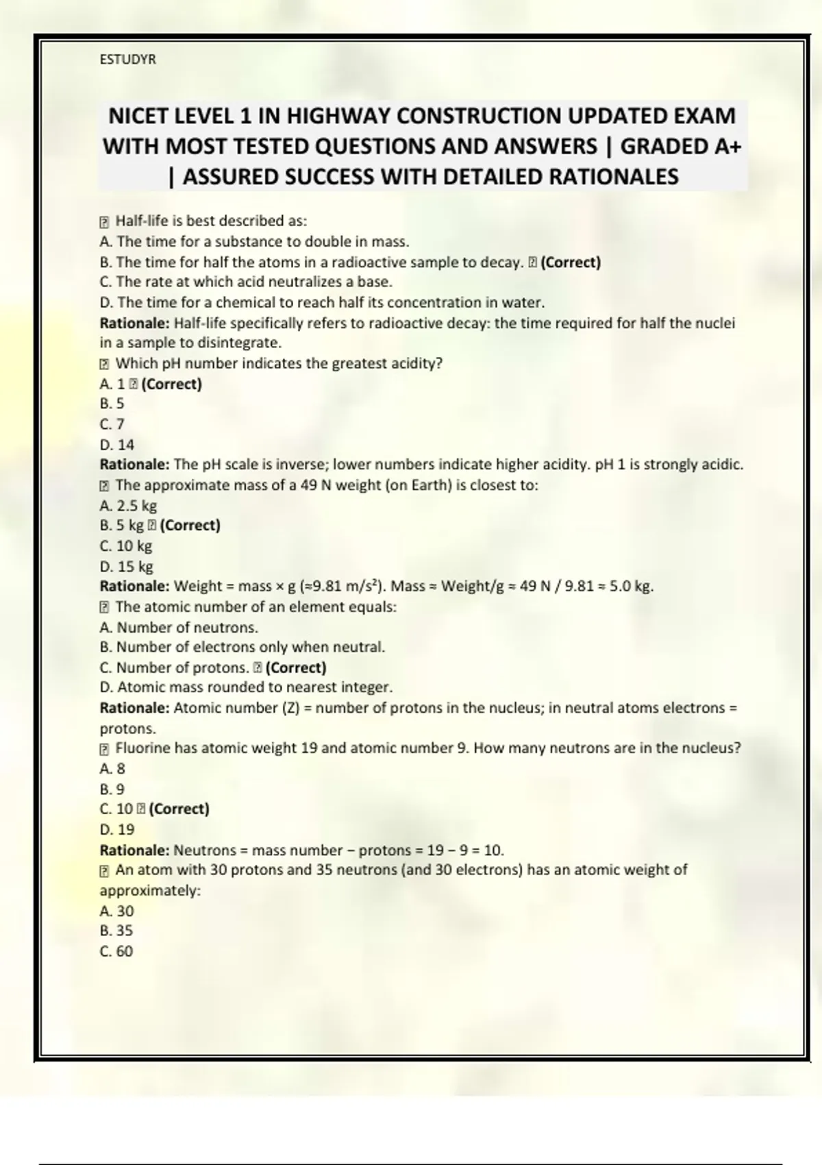 NICET LEVEL 1 IN HIGHWAY CONSTRUCTION UPDATED EXAM WITH MOST TESTED QUESTIONS AND ANSWERS | GRADED A+ | ASSURED SUCCESS WITH DETAILED RATIONALES