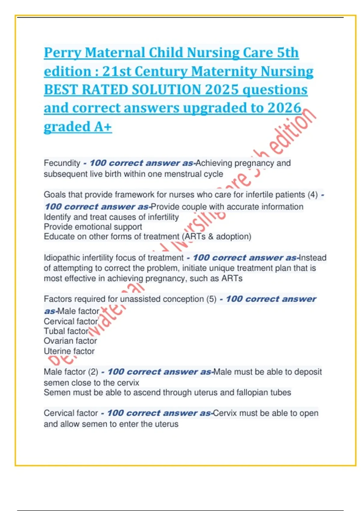 Perry Maternal Child Nursing Care 5th edition : 21st Century Maternity Nursing BEST RATED SOLUTION 2025 questions and correct answers upgraded to 2026 graded A+