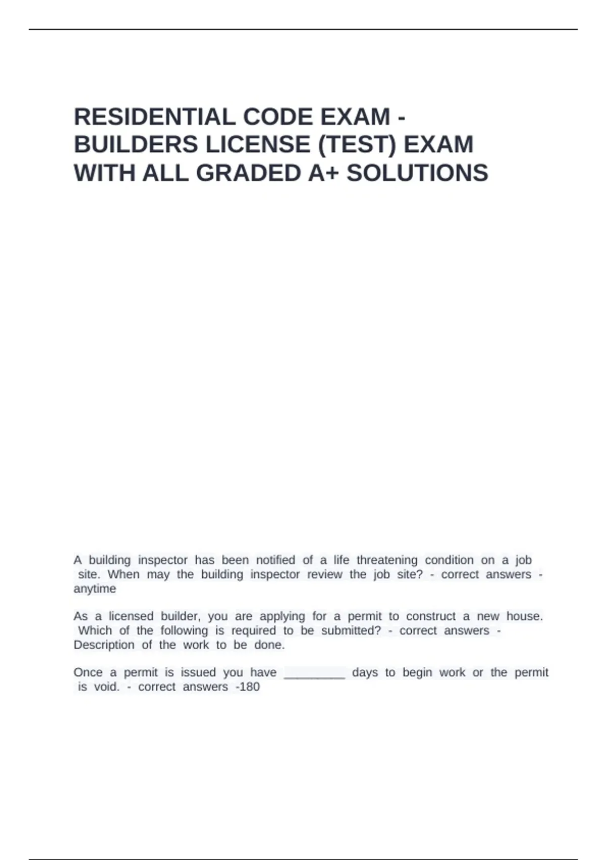 Residential code exam - builders license (TEST) exam with all graded A+ solutions