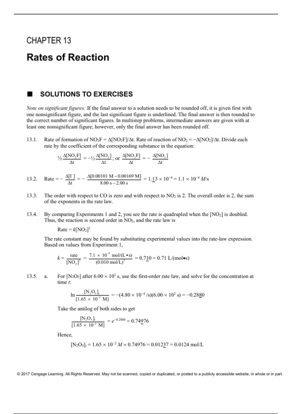 Test Bank – Rates of Reaction – Comprehensive Exercises and Solutions (2025 Update) Note on significant figures: If the final answer to a solution needs to be rounded off, it is given first with one nonsignificant figure, and the last significant figure is underlined. The final answer is then rounded to the correct number of significant figures. In multistep problems, intermediate answers are given with at least one nonsignificant figure; however, only the final answer has been rounded off. 13.1. Rate of formation of NO2F = [NO2F]/t. Rate of reaction of NO2 = −[NO2]/t. Divide each rate by the coefficient of the corresponding substance in the equation: ½ 2 [NOF] t   = −½ 2 [NO] t   ; or 2 [NOF] t   = − 2 [NO] t   13.2. Rate = − -[I ] t   = − [0.00101 M 0.00169 M] 8.00 s 2.00 s    = 1.13  10−4 = 1.1  10−4 M/s 13.3. The order with respect to CO is zero and with respect to NO2 is 2. The overall order is 2, the sum of the exponents in the rate law. 13.4. By comparing Experiment