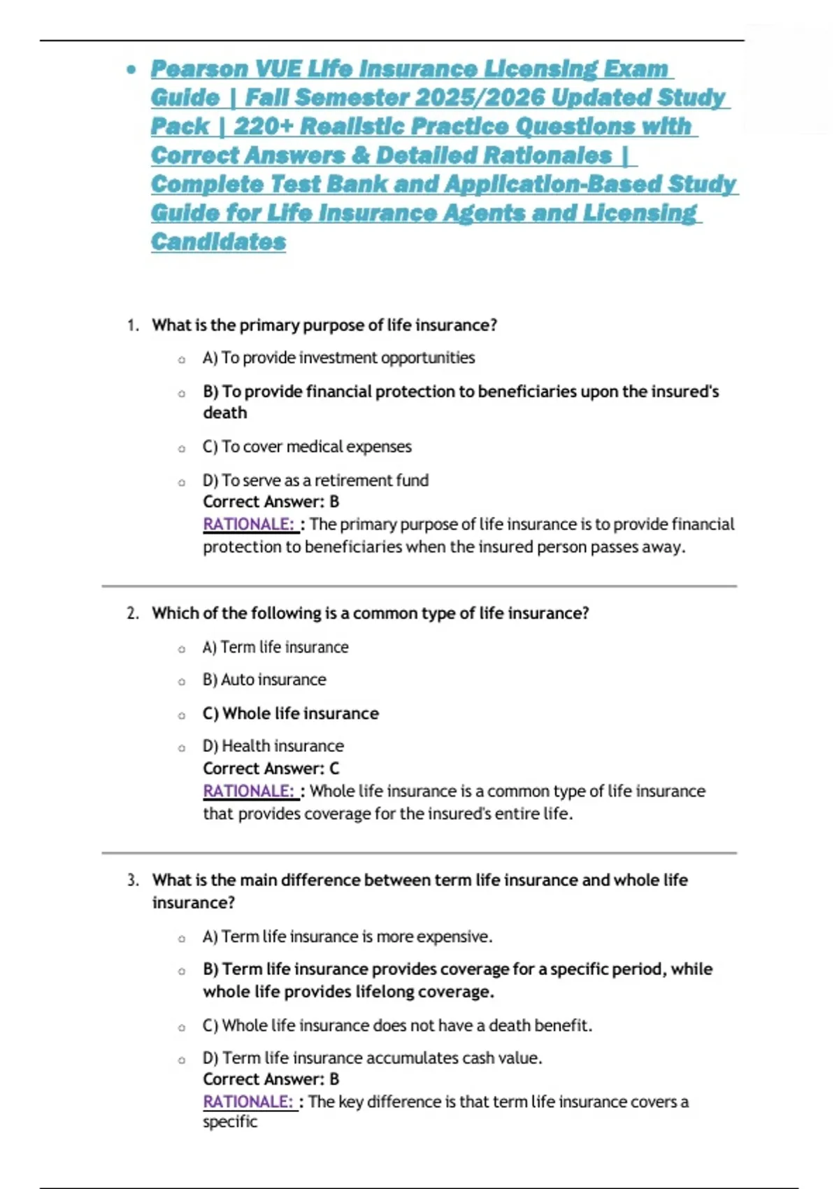 Prepare for your Pearson VUE Life Insurance Licensing Exam with this updated Fall Semester 2025/2026 study guide and complete test bank. Featuring over 220 practice questions with correct answers and detailed rationales, this resource covers essential life insurance concepts, policy provisions, state regulations, and ethical practices. Designed for insurance students and licensing candidates, it provides a thorough review of key exam topics, helping you master both application-based and theory questions for guaranteed confidence on test day.
