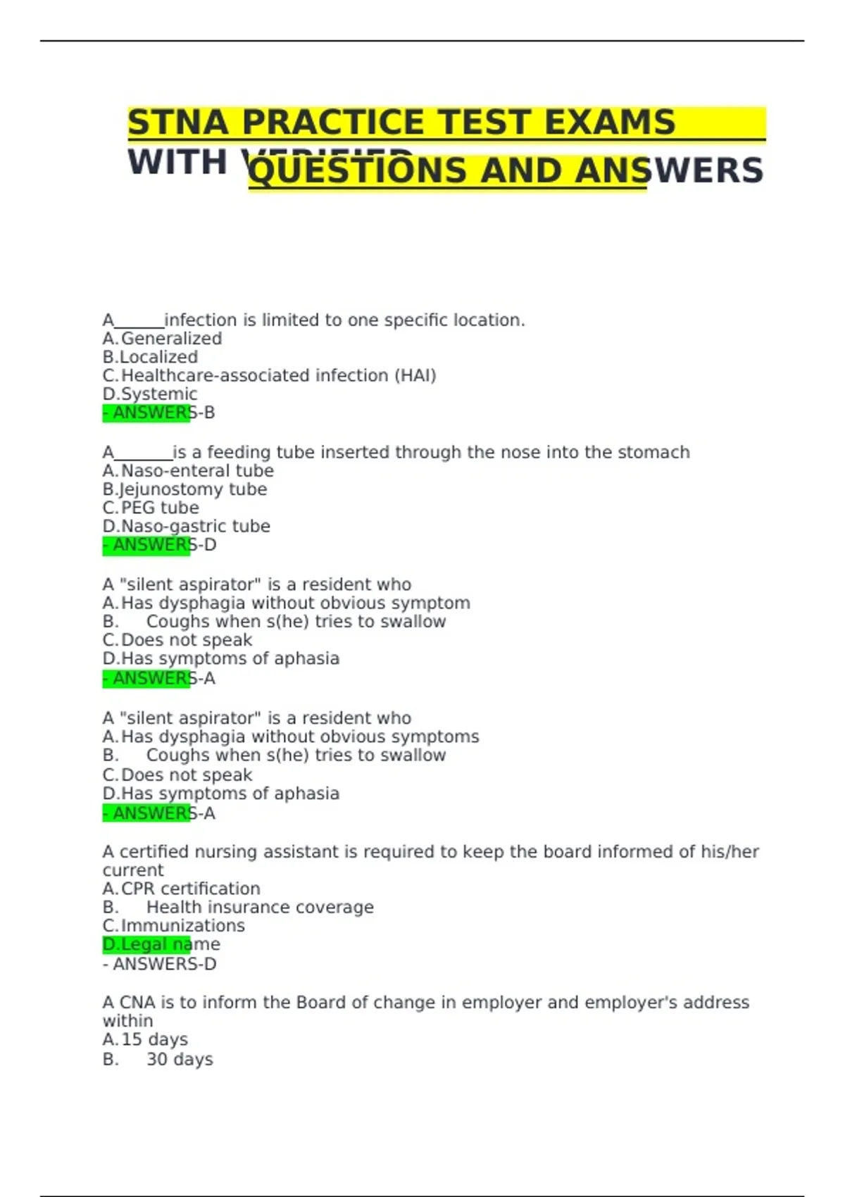 This STNA Practice Test Exams Study Guide 2024/2025 (Grade A+) includes verified questions and correct answers designed to help students prepare effectively for the State Tested Nursing Assistant (STNA) exam. Topics include patient care, infection control, safety procedures, communication skills, resident rights, vital signs, basic nursing skills, and long-term care procedures. Fully updated and verified, this comprehensive guide is ideal for STNA and CNA candidates seeking top exam performance in Ohio and other U.S. states offering STNA certification