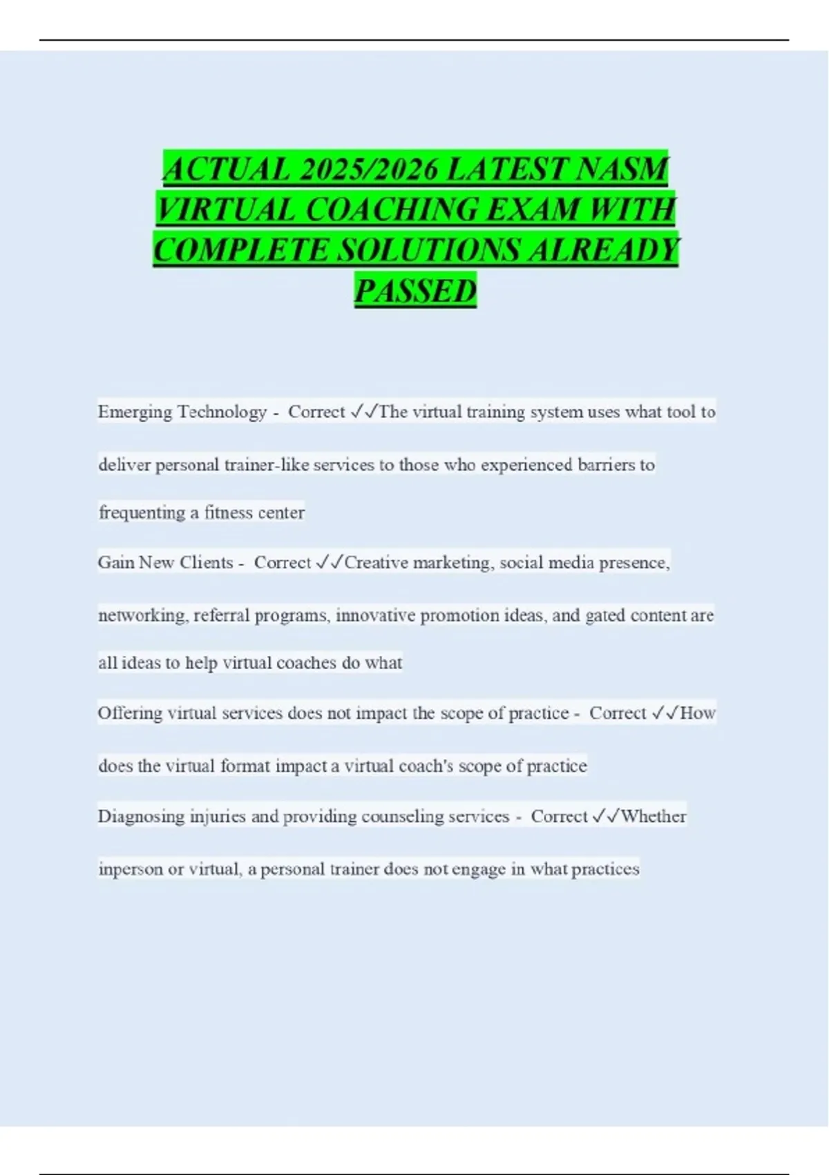 ACTUAL 2025/2026 LATEST NASM VIRTUAL COACHING EXAM WITH COMPLETE SOLUTIONS ALREADY PASSED Emerging Technology - Correct The virtual training system uses what tool to deliver personal trainer-like services to those who experienced barriers to frequenting a fitness center Gain New Clients - Correct Creative marketing, social media presence, networking, referral programs, innovative promotion ideas, and gated content are all ideas to help virtual coaches do what Offering virtual services does not impact the scope of practice - Correct How does the virtual format impact a virtual coach's scope of practice