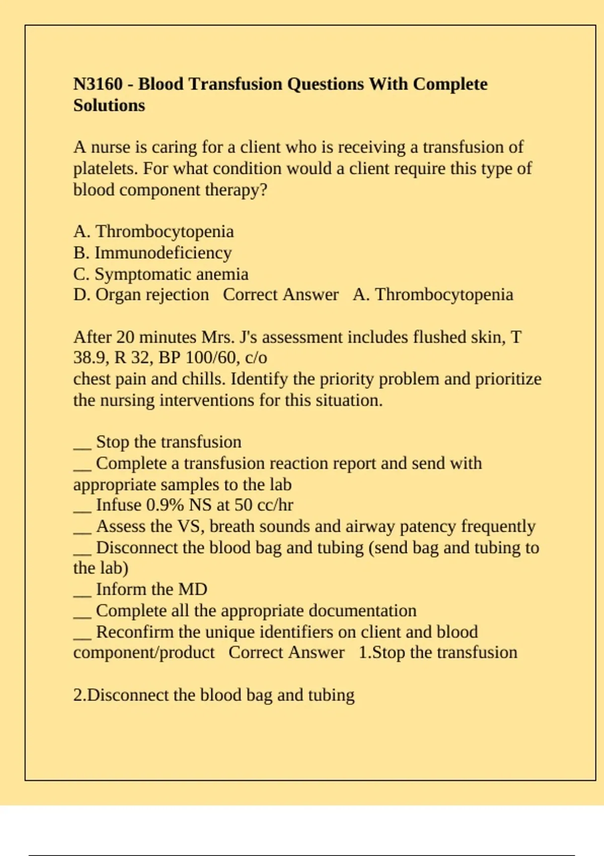 N3160 - Blood Transfusion Questions With Complete Solutions