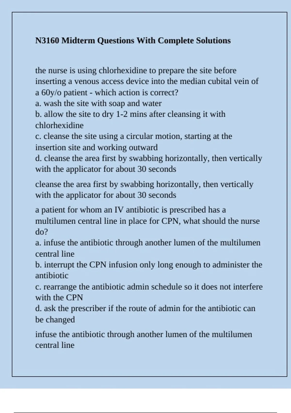 a. infuse the antibiotic through another lumen of the multilumen