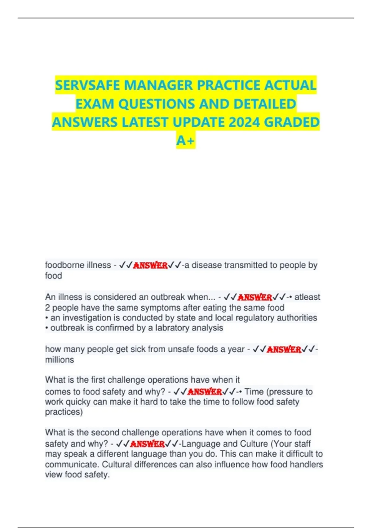 SERVSAFE MANAGER PRACTICE ACTUAL EXAM QUESTIONS AND DETAILED ANSWERS LATEST UPDATE 2024 GRADED A+