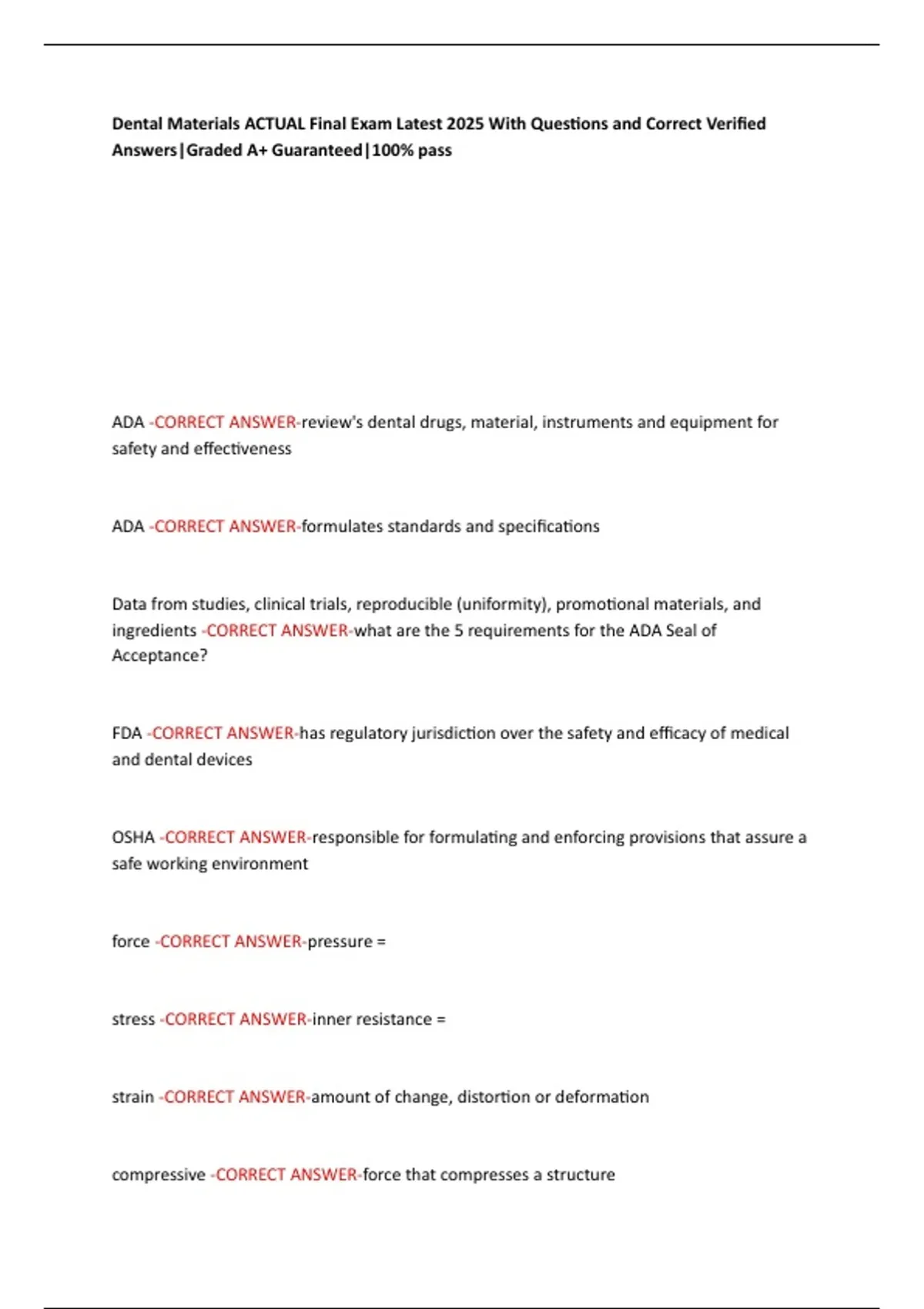 Dental Materials ACTUAL Final Exam Latest 2025 With Questions and Correct Verified