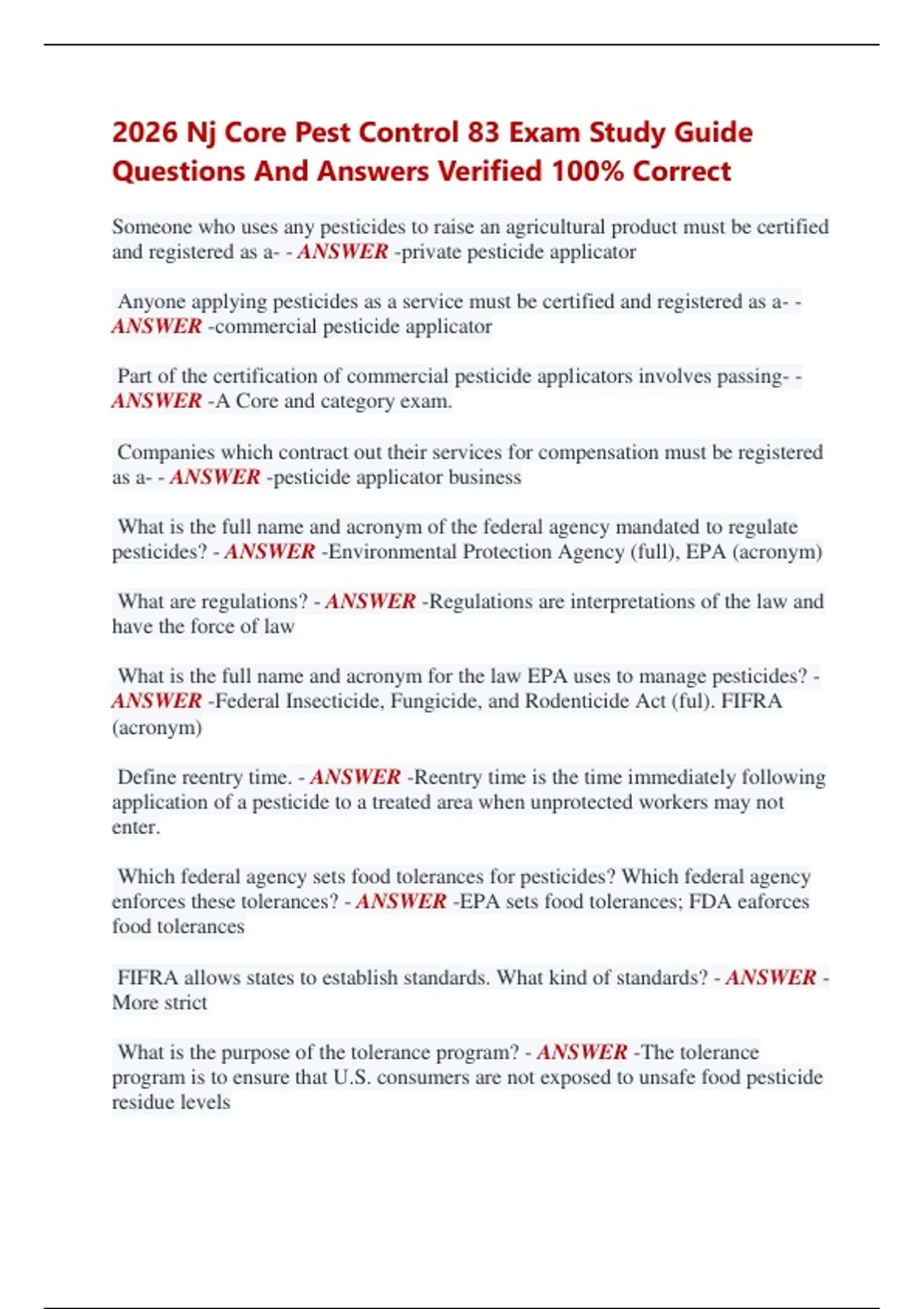 2026 Nj Core Pest Control 83 Exam Study Guide Questions And Answers Verified 100% Correct Someone who uses any pesticides to raise an agricultural product must be certified and registered as a- - ANSWER -private pesticide applicator Anyone applying pesticides as a service must be certified and registered as a- - ANSWER -commercial pesticide applicator Part of the certification of commercial pesticide applicators involves passing- - ANSWER -A Core and category exam. Companies which contract out their services for compensation must be registered as a- - ANSWER -pesticide applicator business What is the full name and acronym of the federal agency mandated to regulate pesticides? - ANSWER -Environmental Protection Agency (full), EPA (acronym) What are regulations? - ANSWER -Regulations are interpretations of the law and have the force of law What is the full name and acronym for the law EPA uses to manage pesticides? - ANSWER -Federal Insecticide, Fungicide, and Rodenticide Act (ful). FIFRA (acronym) Define reentry time. - ANSWER -Reentry time is the time immediately following application of a pesticide to a treated area when unprotected workers may not enter. Which federal agency sets food tolerances for pesticides? Which federal agency enforces these tolerances? - ANSWER -EPA sets food tolerances; FDA eaforces food tolerances FIFRA allows states to establish standards. What kind of standards? - ANSWER More strict What is the purpose of the tolerance program? - ANSWER -The tolerance program is to ensure that U.S. consumers are not exposed to unsafe food pesticide residue levels The regulations interpreting the Transportation Safety Act are contained in 49 CFR. What do these regulations do? - ANSWER -The regulations in 49 CFR cover any safety aspect of transporting hazardous materials, including the packing, repacking, placarding, and routing of such materials Which federal agency determines what species are endangered? - ANSWER -Fish and Wildlife Service (FWS) of the Department of the Interior Who ultimately bears the responsibility of protecting endangered species from pesticides? - ANSWER -You, the applicator The inherent ability ofapesticide to cause injury or poison organisms is called - ANSWER -toxicity Inan LD50, equal to 68 mg/kg the 68 milligrams - ANSWER -pesticide The oral LD50 level which represents a highly toxic pesticide is- - ANSWER 46mg/kg The probability of a pesticide causing adverse effects to an organism is called- - ANSWER -risk It is best to avoid the use of those pesticides which can accumulate and cause undesirable effects in the bodies of desirable organisms. True or false. - ANSWER -True All pesticides can pass through the skin to enter the blood and significantly affect the nervous system of man. True or false. - ANSWER -False The kind of toxicity that results from small, repeated exposures to a pesticide over a period oftime is called - ANSWER -chronic toxicity The signal word on a pesticide label indicates the pesticide's - ANSWER -toxicity Low toxicity is indicated by low LD50. True or false. - ANSWER -False Acute toxicity is a measure of how harmful or poisonous a pesticide is to an animal (or man) from a single exposure. True or false. - ANSWER -True The hazard of a pesticide is - ANSWER -its inherent danger The symptoms of pesticide poisoning are greatly different from those of other types of poisoning and/or illnesses. True or false. - ANSWER -False After an acute, dermal exposure to a moderately or highly toxic pesticide, the first thing to do is - ANSWER -remove the contaminated clothing and shower General symptoms of pesticide poisoning can be - ANSWER -headache and dizziness, nausea and diarrhea, and excessive perspiration and trembling 15.There is no need to supply medical doctors with more information about the symptoms and treatment of pesticide poisoning. True or false. - ANSWER -False It is a good plan to keep your doctor informed about the kinds of pesticides you are using so - ANSWER -he can better diagnose your problem and use the proper treatment Applicators working with highly toxicorgano-23. phosphate orcarbamate insecticides should have their cholinesterase level checked - ANSWER -before spray season starts, at mid-season, and at the end of the season If you are in doubt whether pesticide poisoning has occurred - ANSWER -see your doctor Poisoning which occurs as a result of repeated, small, nonlethal pesticide exposures overalong period of time is called- - ANSWER -chronic poisoning In accidents with pesticides, an applicator can often avoid severe poisoning by practicing proper first aid to reduce exposure. True or false. - ANSWER -True In case of an accident, always save the pesticide container with the label for the doctor to obtain more information. True or false. - ANSWER -True supply of clean water, soap, and a basin can be a great first aid help in- - ANSWER -dermal pesticide exposure For severe dermal exposure to pesticides- - ANSWER -remove contaminated clothing, drench exposed body areas with water dry and wrap in a blanket
