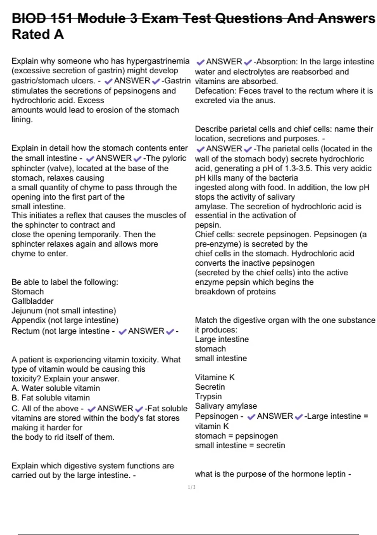 vitamins are stored within the body's fat stores Pepsinogen - ANSWER -Large intestine =