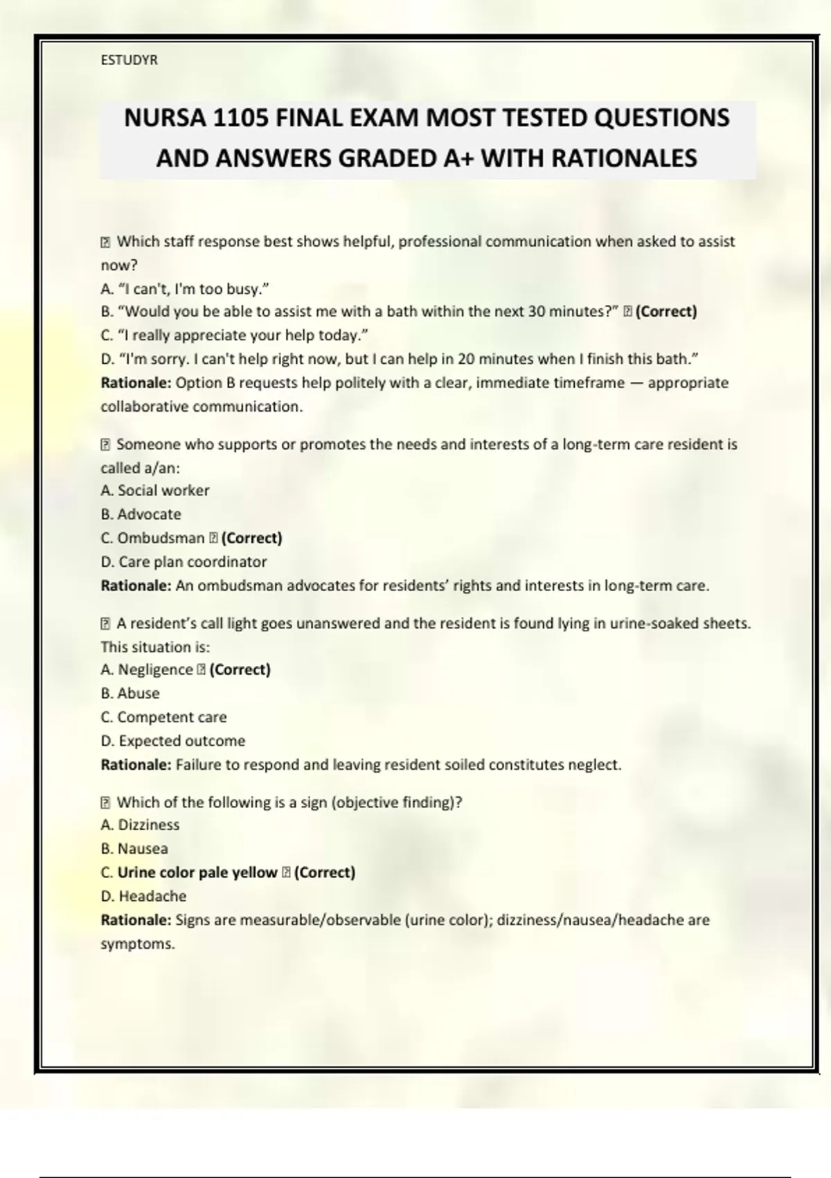 NURSA 1105 FINAL EXAM MOST TESTED QUESTIONS