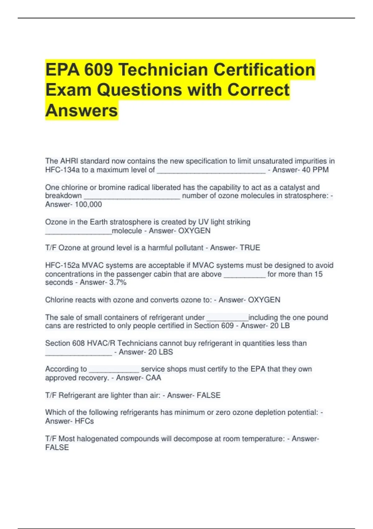 HFC-134a to a maximum level of __________________________ - Answer- 40 PPM