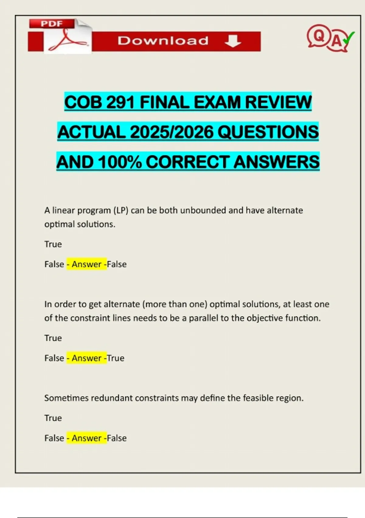 COB 291 FINAL EXAM REVIEW ACTUAL 2025/2026 QUESTIONS AND 100% CORRECT ANSWERS A linear program (LP) can be both unbounded and have alternate optimal solutions. True False - Answer -False In order to get alternate (more than one) optimal solutions, at least one of the constraint lines needs to be a parallel to the objective function. True False - Answer -True Sometimes redundant constraints may define the feasible region. True False - Answer -FalseNeed assistance on Online classes, Exams & Assignments? Reach out for instant help!! Full Course Assistance, Plagiarism-free Essay Writing, Research Paper, Dissertation, Discussion Posts, etc…. Confidential & Secure services. Tutors are available for all subjects! Email now at: The equation of Y-axis is Y=0. True False - Answer -False The lines 7x-14y=42 and 3x-6y=48 do not intersect each other. True False - Answer -True The line for 2x-3y=0 passes through