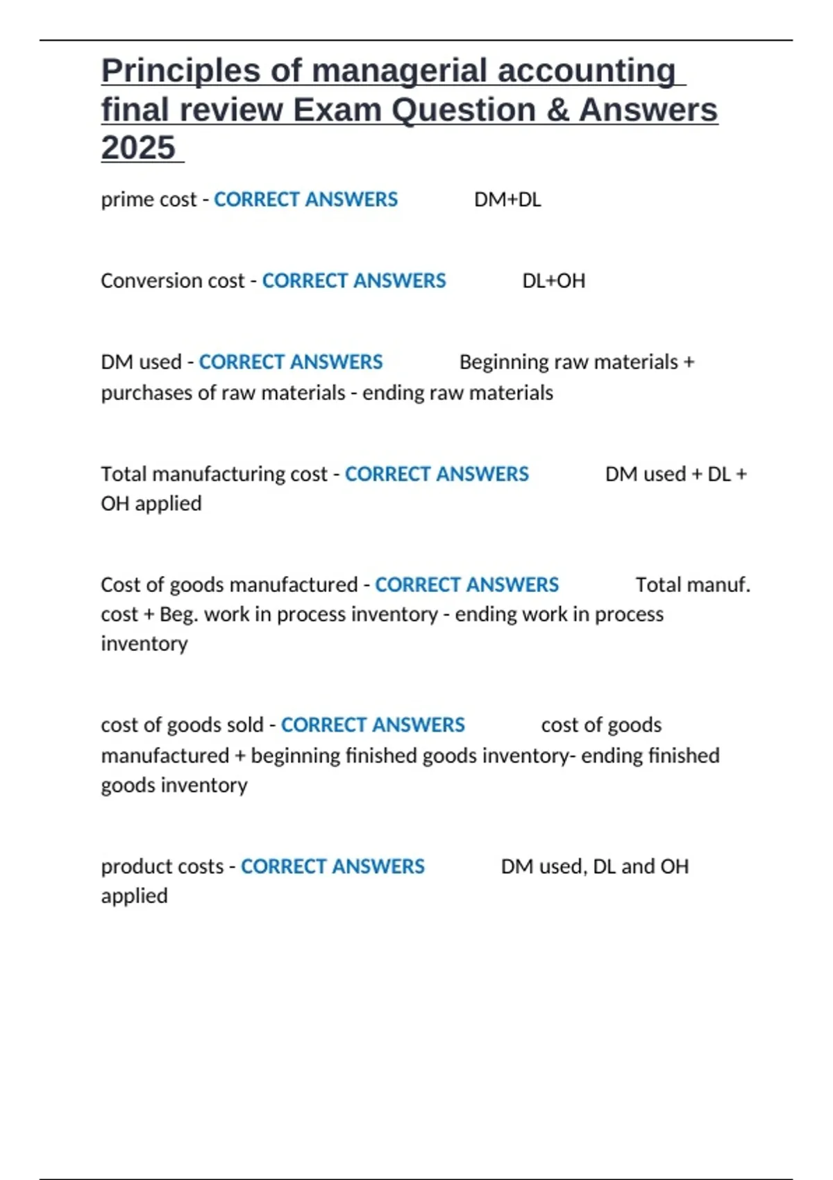 Principles of managerial accounting final review Exam Question & Answers 2025.docx