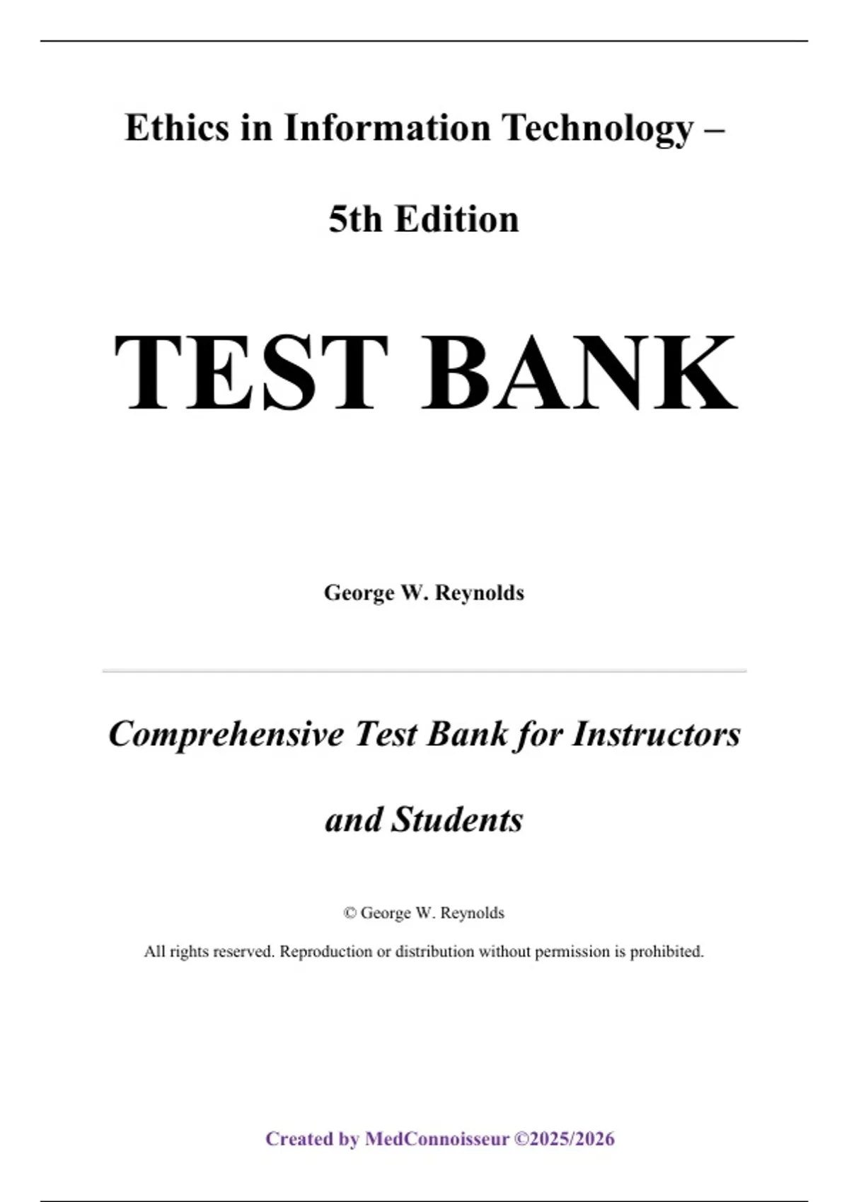 The Test Bank for Ethics in Information Technology, 5th Edition by George W. Reynolds offers a fully verified collection of assessment materials aligned with the official Cengage edition. The test bank includes multiple-choice, true/false, short-answer, and scenario-based questions covering all major topics related to the legal, ethical, and social implications of information technology. These questions support instructors in constructing quizzes, midterms, final exams, and class discussions focused on ethical decision making, emerging technologies, and responsible computing practices. The content follows the publisher’s confirmed Table of Contents in exact order, with chapter numbers and titles in bold: Chapter 1: An Overview of Ethics, Chapter 2: Ethics for IT Workers and IT Users, Chapter 3: Computer and Internet Crime, Chapter 4: Privacy, Chapter 5: Freedom of Expression, Chapter 6: Intellectual Property, Chapter 7: Software Development, Chapter 8: The Impact of Information Technology on Productivity and Quality of Life, Chapter 9: Social Networking, Chapter 10: Ethics of IT Organizations.