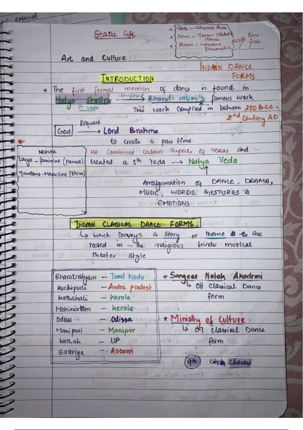 These are my handwritten notes on Indian Classical Dances, covering all major dance forms, their states of origin, key features, and important facts for exam preparation.