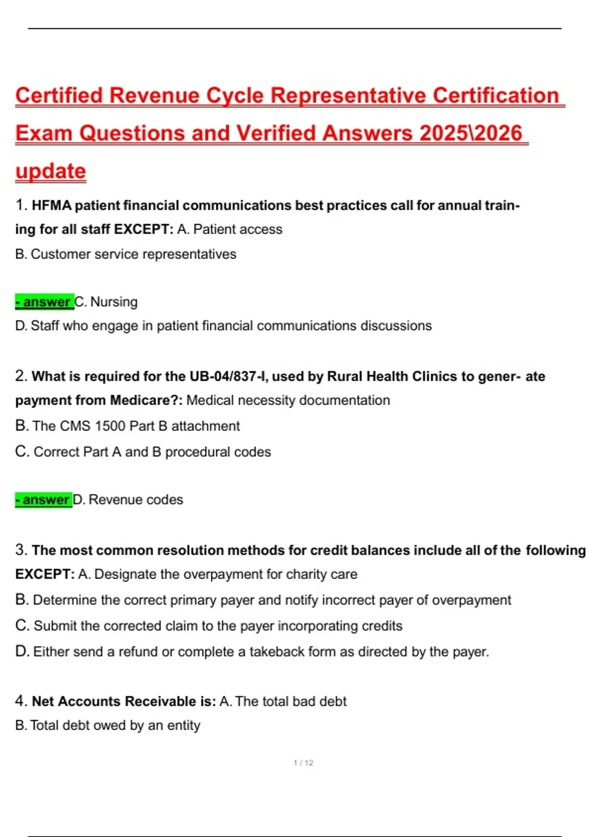 Prepare for the HFMA CRCR certification exam with updated 2025/2026 practice questions and verified answers. Master revenue cycle concepts like UB-04 billing, Medicare regulations, patient financial communications, and compliance for the Certified Revenue Cycle Representative credential. CRCR exam, revenue cycle certification, HFMA CRCR, medical billing exam, healthcare finance, revenue cycle management, CRCR study guide, patient financial services, healthcare certification, medical revenue cycle, HFMA certification, billing and coding