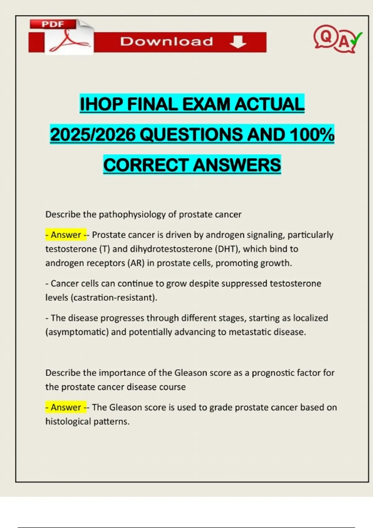 IHOP FINAL EXAM ACTUAL 2025/2026 QUESTIONS AND 100% CORRECT ANSWERS Describe the pathophysiology of prostate cancer - Answer -- Prostate cancer is driven by androgen signaling, particularly testosterone (T) and dihydrotestosterone (DHT), which bind to androgen receptors (AR) in prostate cells, promoting growth. - Cancer cells can continue to grow despite suppressed testosterone levels (castration-resistant). - The disease progresses through different stages, starting as localized (asymptomatic) and potentially advancing to metastatic disease. Describe the importance of the Gleason score as a prognostic factor for the prostate cancer disease course - Answer -- The Gleason score is used to grade prostate cancer based on histological patterns.Need assistance on Online classes, Exams & Assignments? Reach out for instant help!! Full Course Assistance, Plagiarism-free Essay Writing, Research Paper, Dissertation, Discussion Posts, etc…. Confidential & Secure services. Tutors are available for all subjects! Email now at: - A higher Gleason score (7-10) indicates more aggressive disease, worse prognosis, and a greater likelihood of metastasis. - It helps guide treatment decisions, such as the need for immediate intervention vs. active surveillance. Define androgen deprivation therapy (ADT) - Answer -- ADT is the suppression of androgen production to limit prostate cancer growth. - Can be achieved via orchiectomy (surgical castration) or medication (LHRH agonists /antagonists and antiandrogens). - The goal is to reduce testosterone levels to <50 ng/dL. List common adverse events or consequences of ADT - Answer -- Hot flashes - Erectile dysfunction - decreased libido - Fatigue - Osteoporosis- Increased risk of cardiovascular disease - Metabolic effects (weight gain, insulin resistance) Describe the general treatment approach for a patient with prostate cancer, including scenarios when chemotherapy, abiraterone, or antiandrogens are used - Answer -Localized Disease: Active surveillance, surgery, or radiation. Metastatic Disease: ADT is the