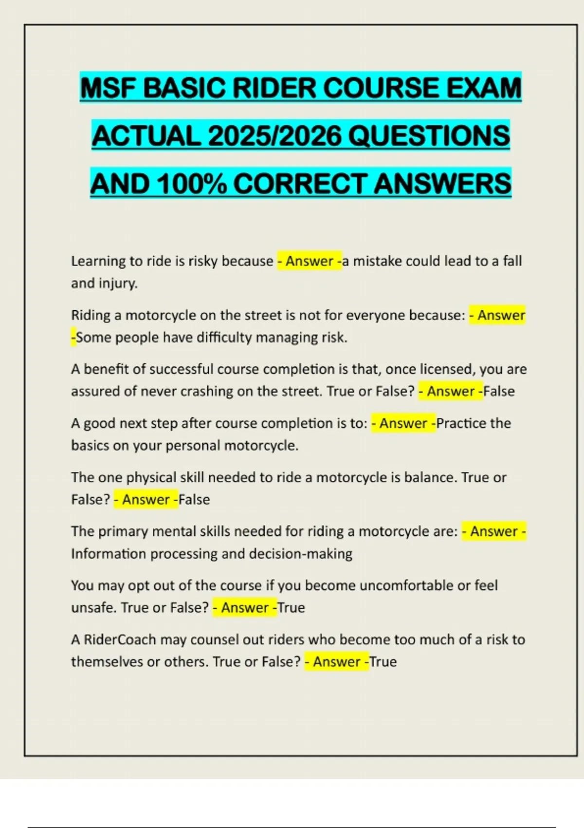 MSF BASIC RIDER COURSE EXAM ACTUAL 2025/2026 QUESTIONS AND 100% CORRECT ANSWERS Learning to ride is risky because - Answer -a mistake could lead to a fall and injury. Riding a motorcycle on the street is not for everyone because: - Answer -Some people have difficulty managing risk. A benefit of successful course completion is that, once licensed, you are assured of never crashing on the street. True or False? - Answer -False A good next step after course completion is to: - Answer -Practice the basics on your personal motorcycle. The one physical skill needed to ride a motorcycle is balance. True or False? - Answer -False The primary mental skills needed for riding a motorcycle are: - Answer - Information processing and decision-making You may opt out of the course if you become uncomfortable or feel unsafe. True or False? - Answer -True A RiderCoach may counsel out riders who become too much of a risk to themselves or others. True or False? - Answer -TrueWhich of the following descriptions apply to Standard-type motorcycles? - Answer -Straight-up seating position Which type of motorcycle features rear-positioned footrests, high power-to-weight ratio, and a forward leaning ride? - Answer -Sport Sport-type motorcycles typically feature a higher than average powerto-weight ratio. True or False? - Answer -True Which of the following motorcycle types is designed for riders focused on long-distance riding? - Answer -Touring Touring-style motorcycles are designed primarily for riders who enjoy both highway and non-highway riding. True or False? - Answer -False Because scooters have small engines, wearing a helmet is of little value. True or False? - Answer -False All states use the same definitions, regulations, and requirements for motorcycles. True or False? - Answer -False The throttle is operate