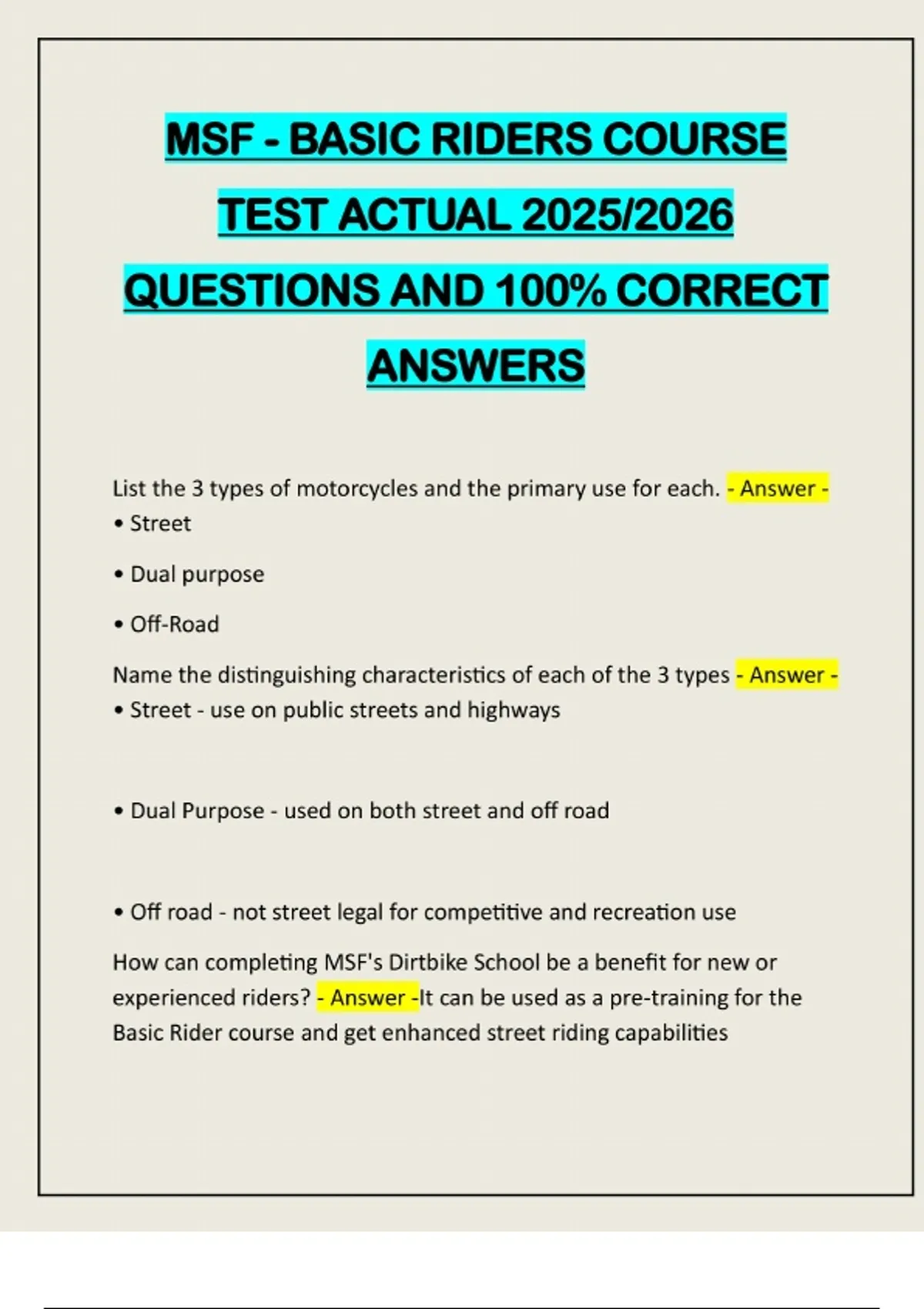 MSF - BASIC RIDERS COURSE TEST ACTUAL 2025/2026 QUESTIONS AND 100% CORRECT ANSWERS List the 3 types of motorcycles and the primary use for each. - Answer - • Street • Dual purpose • Off-Road Name the distinguishing characteristics of each of the 3 types - Answer - • Street - use on public streets and highways • Dual Purpose - used on both street and off road • Off road - not street legal for competitive and recreation use How can completing MSF's Dirtbike School be a benefit for new or experienced riders? - Answer -It can be used as a pre-training for the Basic Rider course and get enhanced street riding capabilitiesName 2 primary differences between cars/trucks and motorcycles - Answer -• Motorcycles don't have the stability of cars and must be balanced • Motorcycles leave you more vulnerable in crashes because of less protection • Motorcycles are not as visible as cars and trucks because of size What are the problems that these differences cause? - Answer -• Motorcycles must be balanced • Motorcycles leave you more vulnerable, less protection • Motorcycles are less visible Describe one crash from your group's experience (or that you are aware of), and briefly describe the circumstances. What would some preventive measures be? - Answer -Only answered after group crash session! Who is responsible for safety? - Answer -Everyone is responsible for safety How can someone tell if they would likely be dangerous on a motorcycle? - Answer -If they have several close calls or near misses driving a car