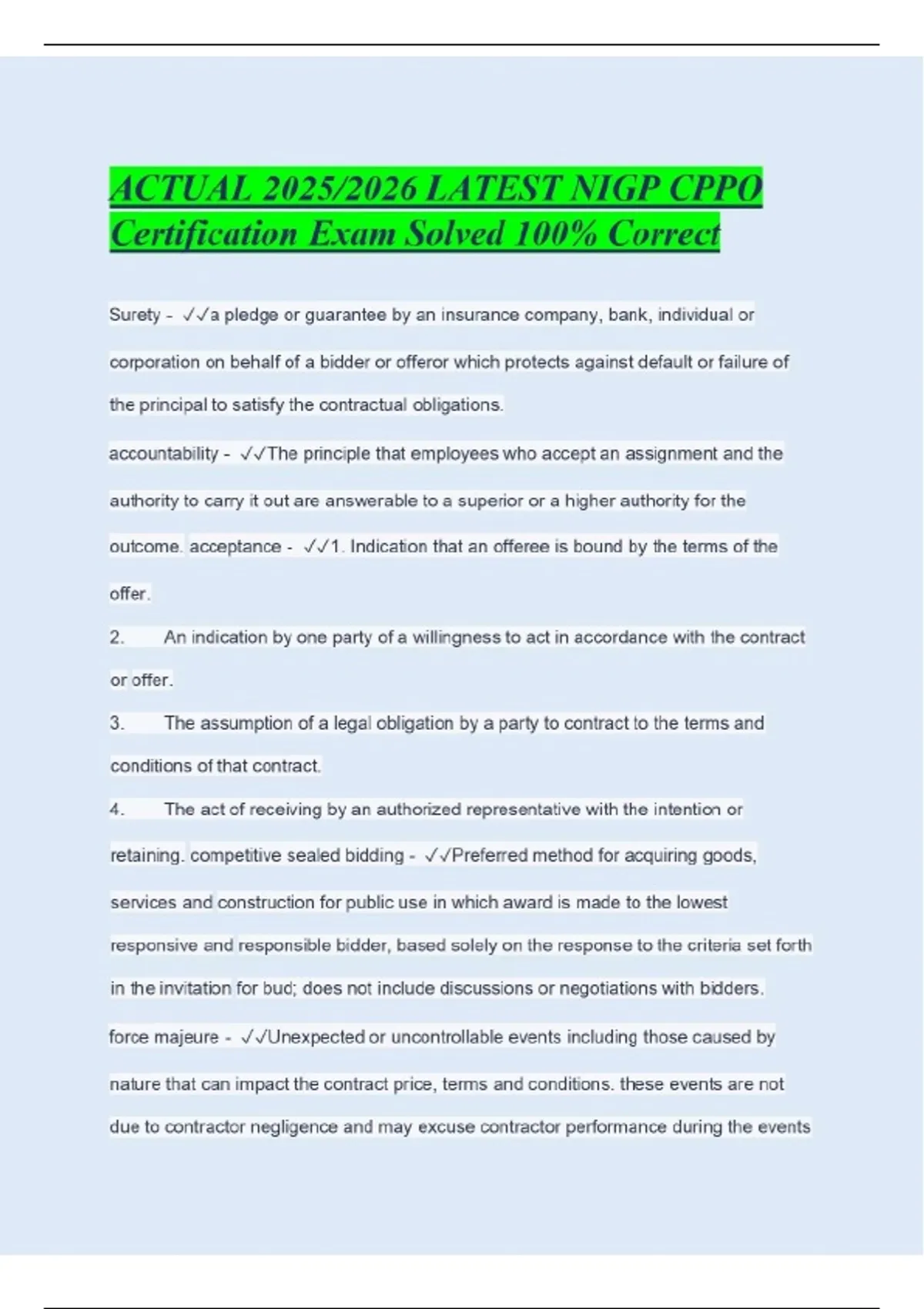 ACTUAL 2025/2026 LATEST NIGP CPPO Certification Exam Solved 100% Correct Surety - a pledge or guarantee by an insurance company, bank, individual or corporation on behalf of a bidder or offeror which protects against default or failure of the principal to satisfy the contractual obligations. accountability - The principle that employees who accept an assignment and the authority to carry it out are answerable to a superior or a higher authority for the outcome. acceptance - 1. Indication that an offeree is bound by the terms of the offer.