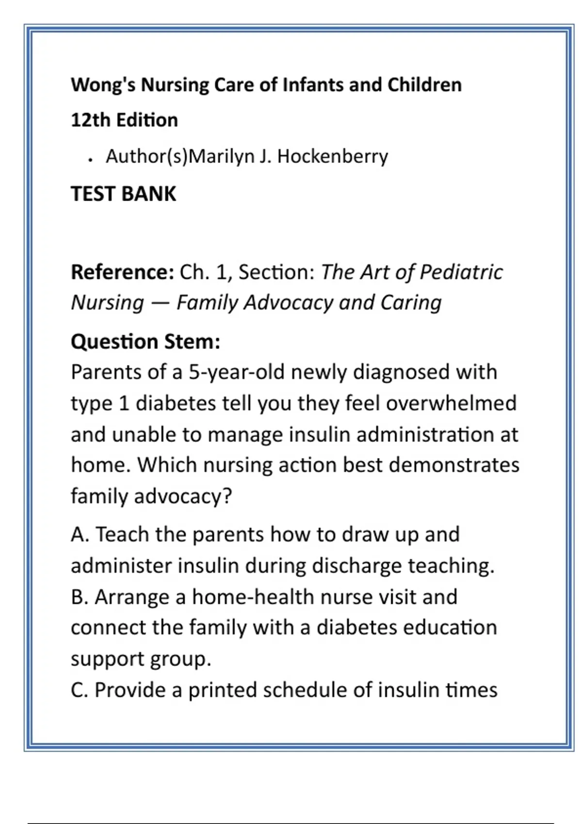 Wong’s Nursing Care of Infants and Children 12th Edition Test Bank | 20 NCLEX HESI Questions per Chapter with Answers & Rationales Description: Master pediatric nursing and clinical judgment with the Wong’s Nursing Care of Infants and Children (12th Edition) Test Bank by Marilyn J. Hockenberry — the most comprehensive and evidence-based NCLEX/HESI-style question resource for nursing students and educators. This expertly crafted test bank delivers complete, chapter-by-chapter coverage of the leading pediatric nursing textbook, featuring 20 original NCLEX and HESI-style multiple-choice questions per chapter—each with correct answers and verified rationales aligned with Wong’s Nursing Care of Infants and Children (12th Edition). Full-textbook coverage: Includes every chapter, from health promotion to critical care. 20 evidence-based NCLEX/HESI questions per chapter: Designed to assess application, analysis, and clinical reasoning. Verified answers and rationales: Based directly on textbook concepts and current pediatric nursing standards. Focus on clinical judgment: Builds the six cognitive skills tested on the NCLEX Next Gen exam. Perfect for nursing students, faculty, and exam preparation: Ideal for NCLEX-RN, HESI, and ATI review. Each question is designed to strengthen your ability to recognize cues, prioritize interventions, and make safe, effective nursing decisions. Whether you’re reviewing for class, preparing for exams, or building clinical reasoning mastery, this complete Wong’s 12th Edition Test Bank is your key to success. The ultimate study tool to boost your confidence, master pediatric nursing, and pass your exams on the first try! Keywords (SEO-optimized): Wong’s Nursing Care test bank, pediatric nursing questions, NCLEX HESI test bank, nursing exam practice, Hockenberry 12th edition, nursing MCQs with answers, pediatric care nursing review, nursing education study guide, NCLEX pediatric prep, clinical judgment nursing, HESI pediatric review, nursing school resources, nursing test bank PDF, NCLEX question bank, Wong’s textbook questions, pediatric nursing exam prep, evidence-based nursing rationales, NCLEX study materials, nursing instructor resources, ATI and HESI practice Hashtags: #WongsNursingCare #TestBank #NCLEXPrep #HESIExam #PediatricNursing #NursingStudents #NursingEducation #ClinicalJudgment #NursingExams #StudyResources