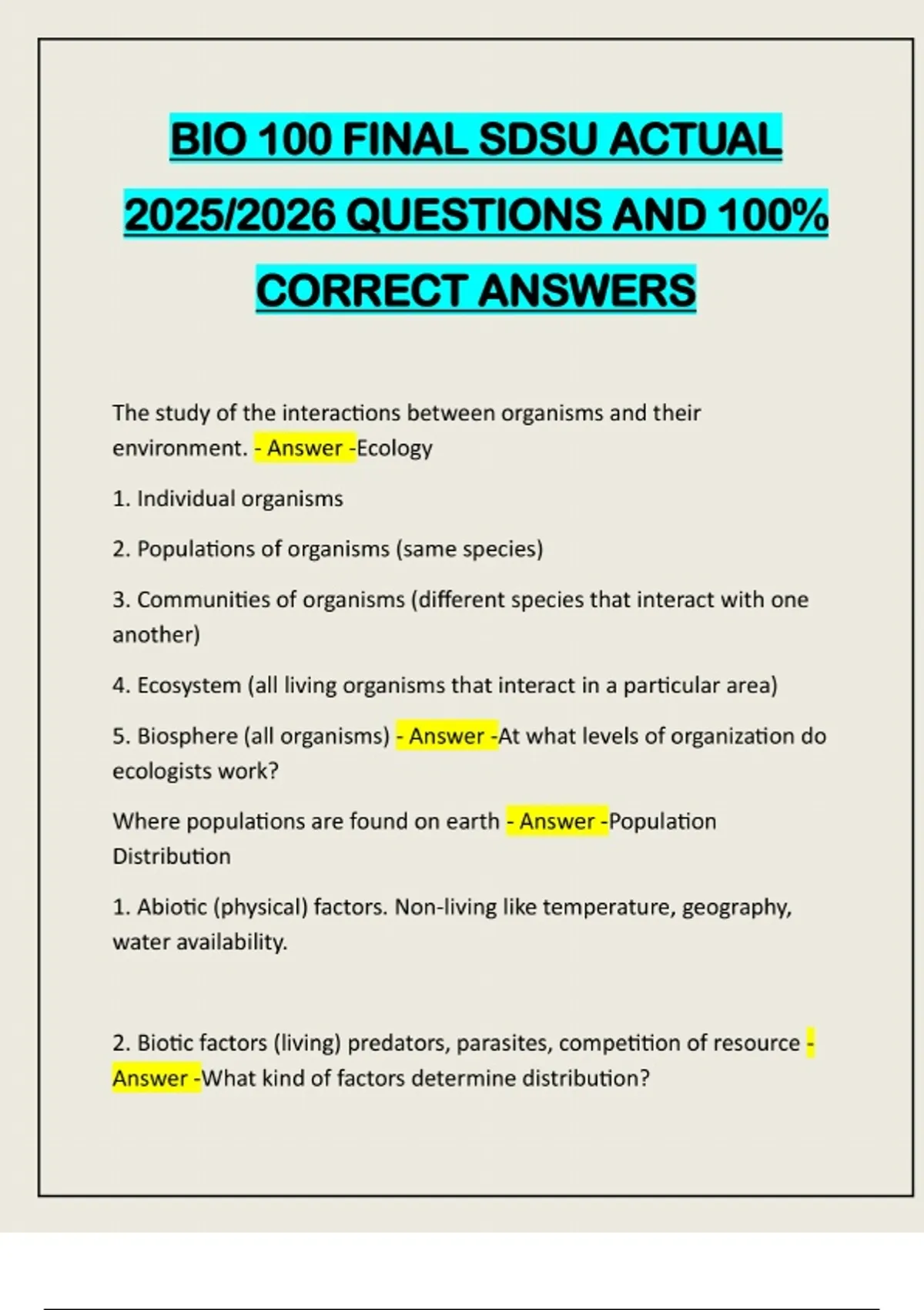 BIO 100 FINAL SDSU ACTUAL 2025/2026 QUESTIONS AND 100% CORRECT ANSWERS The study of the interactions between organisms and their environment. - Answer -Ecology 1. Individual organisms 2. Populations of organisms (same species) 3. Communities of organisms (different species that interact with one another) 4. Ecosystem (all living organisms that interact in a particular area) 5. Biosphere (all organisms) - Answer -At what levels of organization do ecologists work? Where populations are found on earth - Answer -Population Distribution 1. Abiotic (physical) factors. Non-living like temperature, geography, water availability. 2. Biotic factors (living) predators, parasites, competition of resource - Answer -What kind of factors determine distribution?Indicates size, The number of organisms per unit of area/volume (used when there is a great number of organisms in a population. - Answer - What is population density? B = Birth Rate D = Death Rate R = Population growth - Answer -What do r, b, and d symbolize and how are they related? Exponential growth: Population growth that is not hindered by a limiting factor. Growth without limits. Logistic Growth: Population size grows and decreases within the carrying capacity due to a limiting factor. - Answer -Compare and contrast exponential growth and logistic growth. Maximum population size that an environment can support. - Result of density-dependent factos - Birth and death rates change - growth rate changes - Answer -What is K? Density dependent: Lack of food, lack of space. Pretty much things caused by over-population/competition.Density Independent: Fires, floods, natural disasters, etc. - Answer - Define density-dependent factors and density-independent factors. 1. Type I - High survivorship until old age, then rapid decrease (humans and elephants) 2. Type II - Survivorship decreases at a steady, regular rate (birds) 3. Type III - High mortality in early life, but those that survive live long lives. (sea turtles) - Answer -What are the 3 types of survivorship curves? Predators lag behind the pray. When the amount of hares increase, the amount of lynx will increase because there is plenty of resources. However, if the lynx kill too many hares, there won't be enough resources and they will decrease. Less predators will then allow hare population to increase again. - Answer -Lynx-Hare Cycle Triangular = birth rates high, but death rates high as well. (Developing countries) Rectangular = Low Birth and death rates (slow growth) (industrial countries). - Answer -Population age pyramids (triangular vs rectangular) The changing of birth and death rates as a country goes from preindustrial to industrial to developed. - Answer -What is demographic transition?