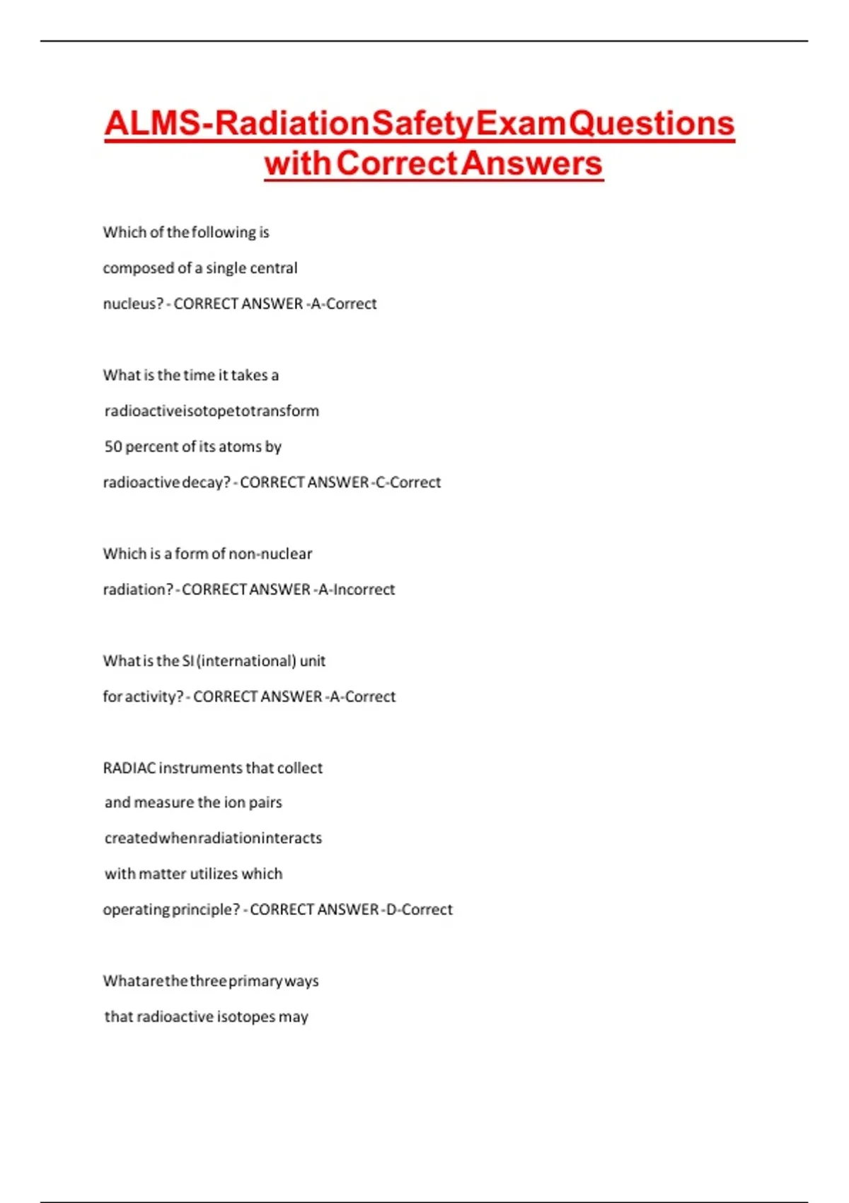 ALMS- Radiation Safety Exam Questions with Correct AnswersALMS- Radiation Safety Exam Questions with Correct AnswersALMS- Radiation Safety Exam Questions with Correct AnswersALMS- Radiation Safety Exam Questions with Correct AnswersALMS- Radiation Safety Exam Questions with Correct Answers