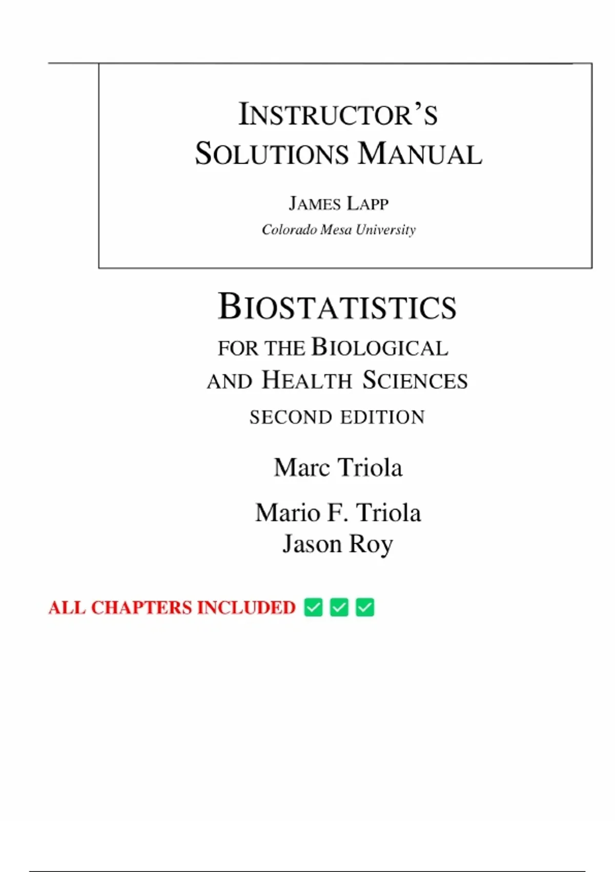 Biostatistics for the Biological and Health Sciences, 2nd Edition – Marc M. Triola, Mario F. Triola & Jason Roy – Complete Solutions Manual (14 Chapters)...Exploring, and Comparing Data, Chapter 4 Probability, Chapter 5 Discrete Probability Distributions, Chapter 6 Normal Probability Distributions, Chapter 7 Estimating Parameters and Determining Sample Sizes, Chapter 8 Hypothesis Testing, Chapter 9 Inferences from Two Samples, Chapter 10 Correlation and Regression, Chapter 11 Goodness-of-Fit and Contingency Tables, Chapter 12 Analysis of Variance, Chapter 13 Nonparametric Tests, Chapter 14 Survival Analysis
